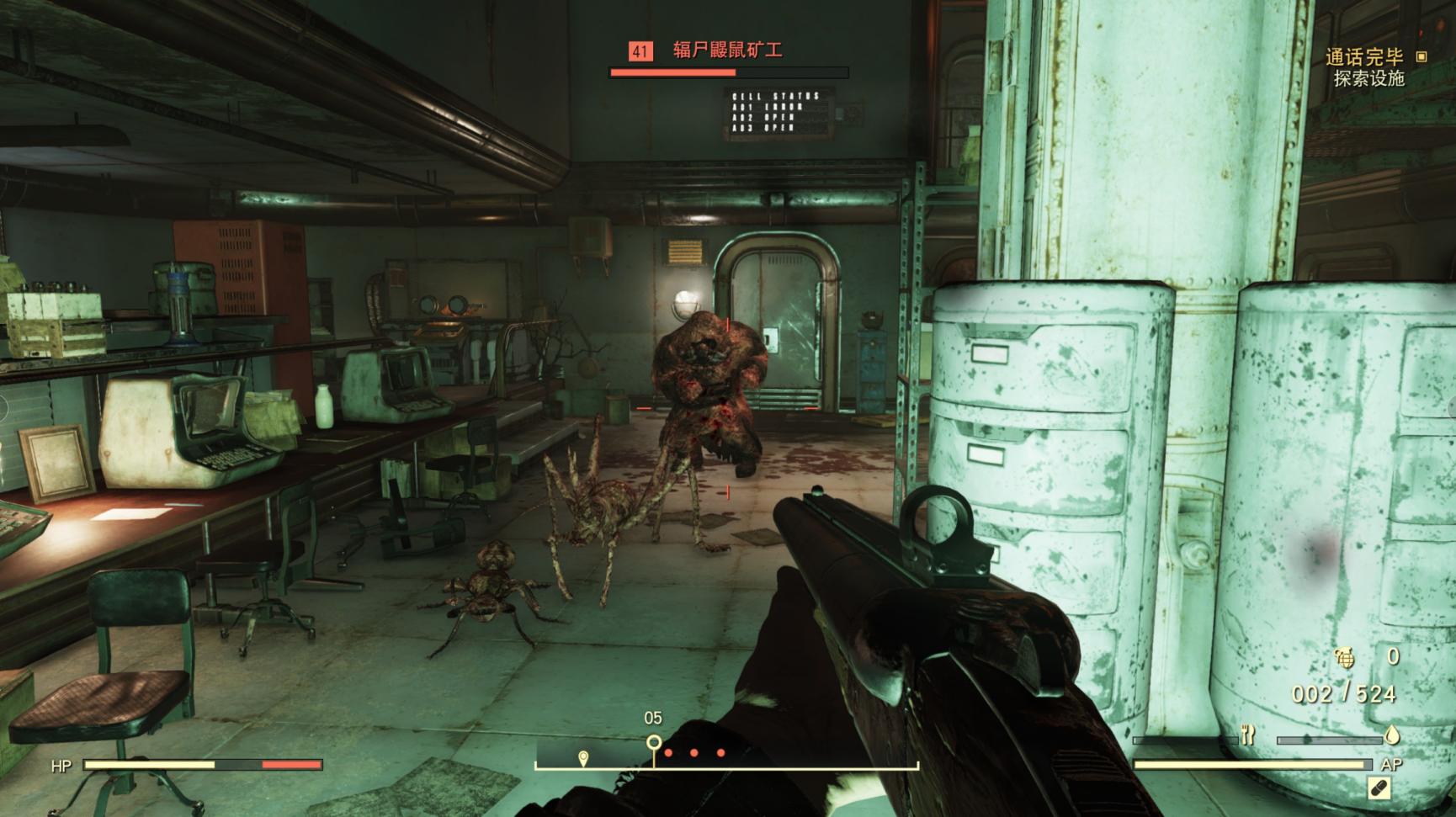 经过调查定位,这个信号来源出自76号避难所西北的一个区域,我们达到后才发现,这里是一处曾经的军方秘密实验室,地下全是用来做生化实验的动物,自然,核爆让曾经的人类死去,但变异的动物却全部留了下来:辐射蟑螂、巨型灶马蟋蟀、辐射工蚁、辐尸鼹鼠矿工、辐尸人、辐尸人首领(这家伙居然穿着辐射4代中的T系列动力机甲!),就连死亡爪这里都有!不仅如此,玻璃容器中还静静躺着一些已经因为实验失败而死去的泥沼蟹杀手和泥沼蟹王,整个区域相当阴森恐怖。