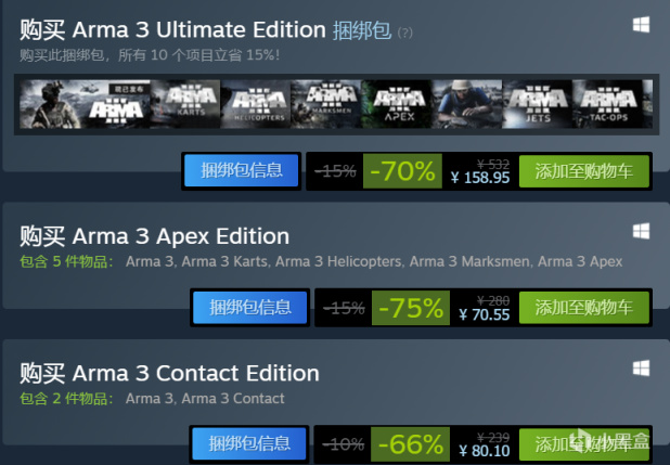 《Arma 3 Apex Edition》:《Arma 3》游戏、《Arma 3 Apex》DLC和各种其他 DLC 包(含一系列额外武器、载具、装备和场景)。