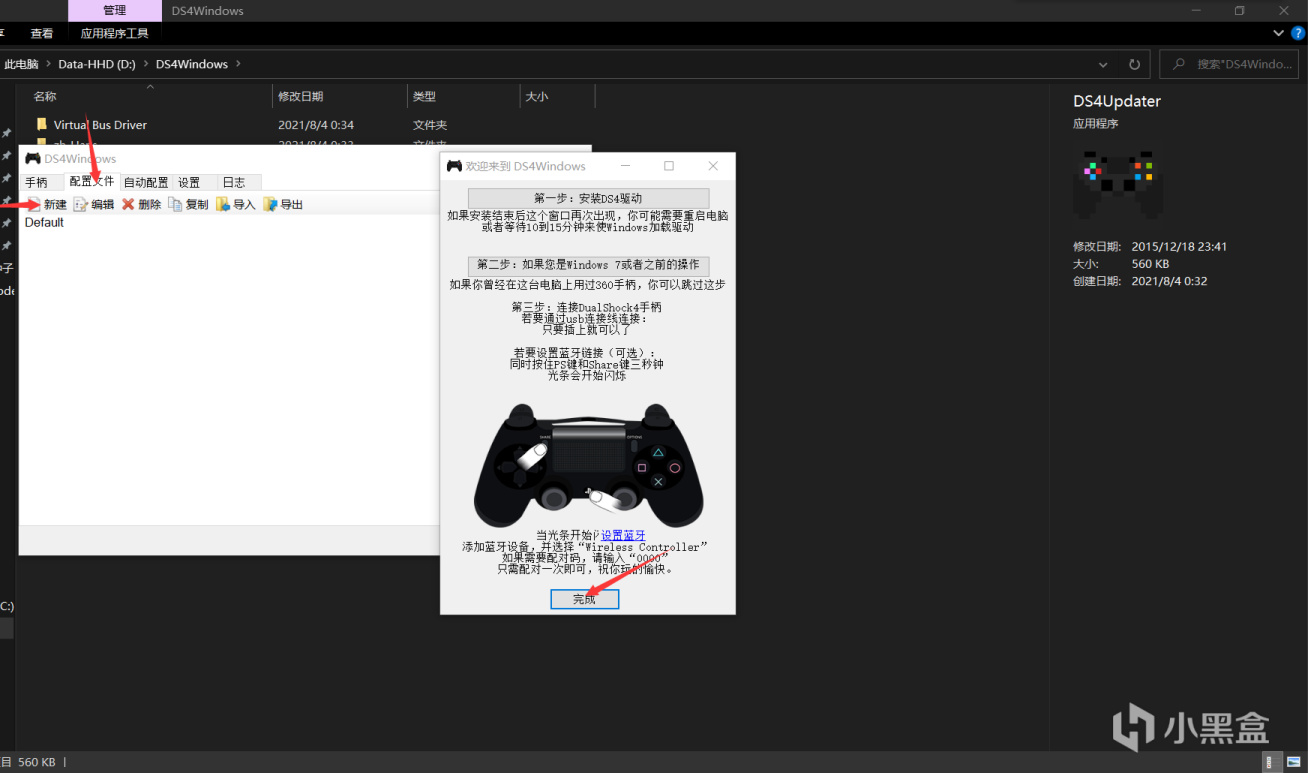 将手柄连接至电脑,选择完成,再选择配置文件-新建
