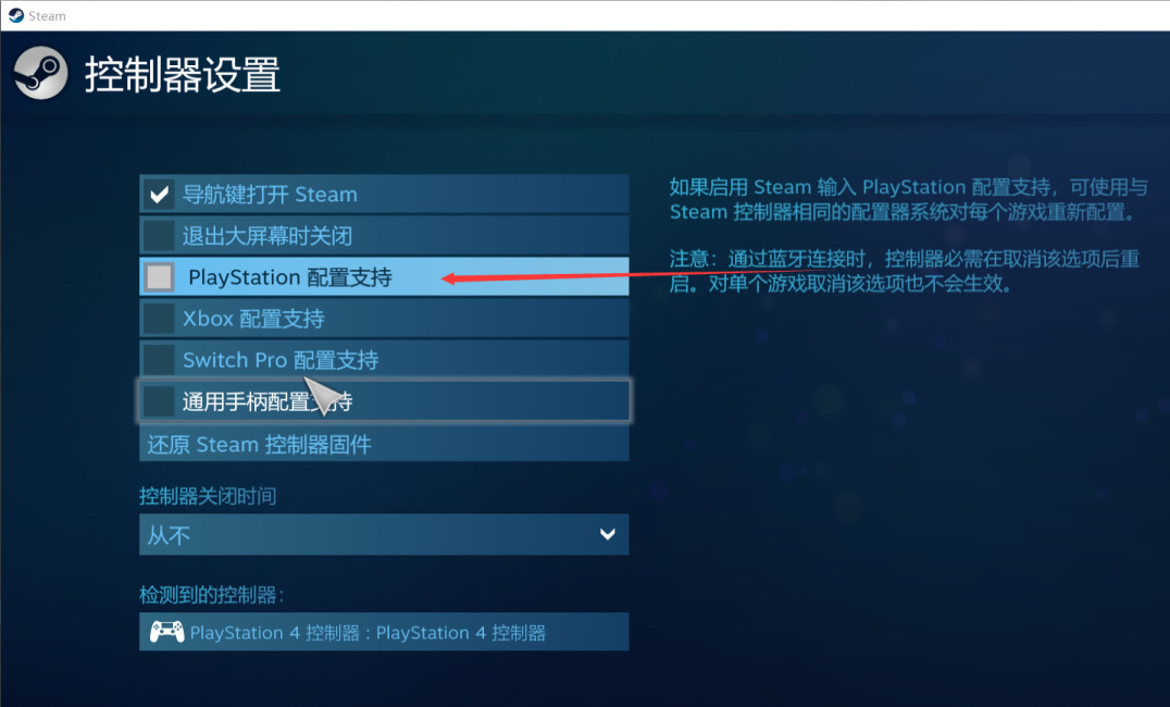 首先在Steam客户端左上角选择Steam-设置-控制器-常规控制器设置,关闭PlayStation配置支持