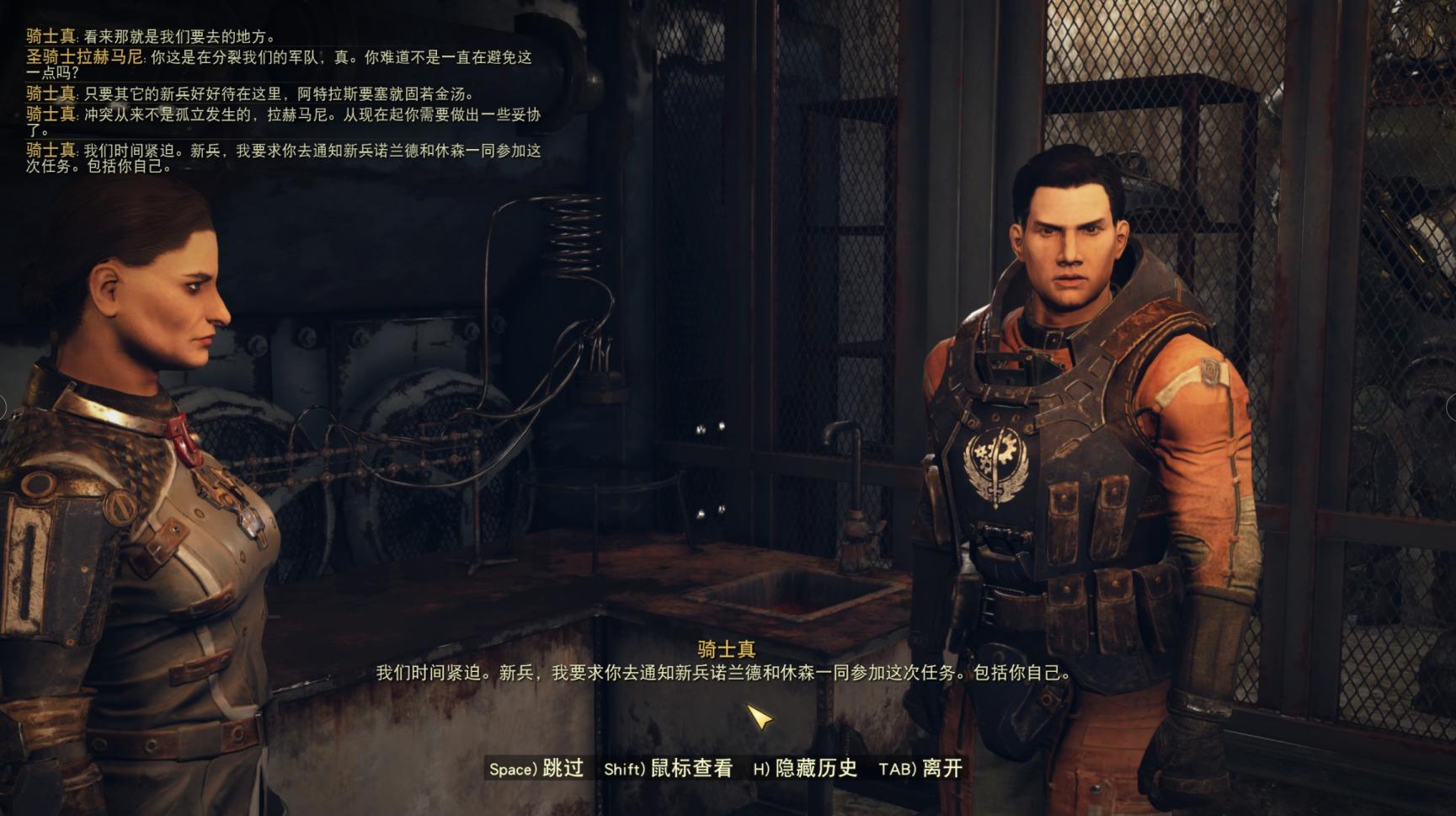 回去向骑士真以及圣骑士报告,骑士真听后则会非常生气,他时刻不忘钢铁兄弟会的建会初衷,一切以保卫人民重建世界为基准,所以有居民在管辖范围内被变种人攻击是他所不能容忍的,于是,他命令我们和新兵诺兰德以及女兵休森一同参加本次任务。