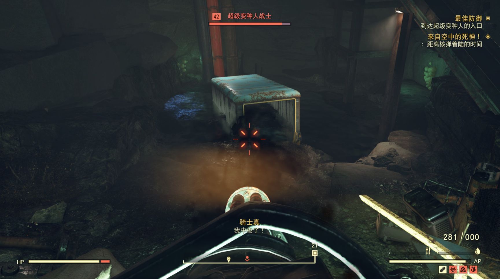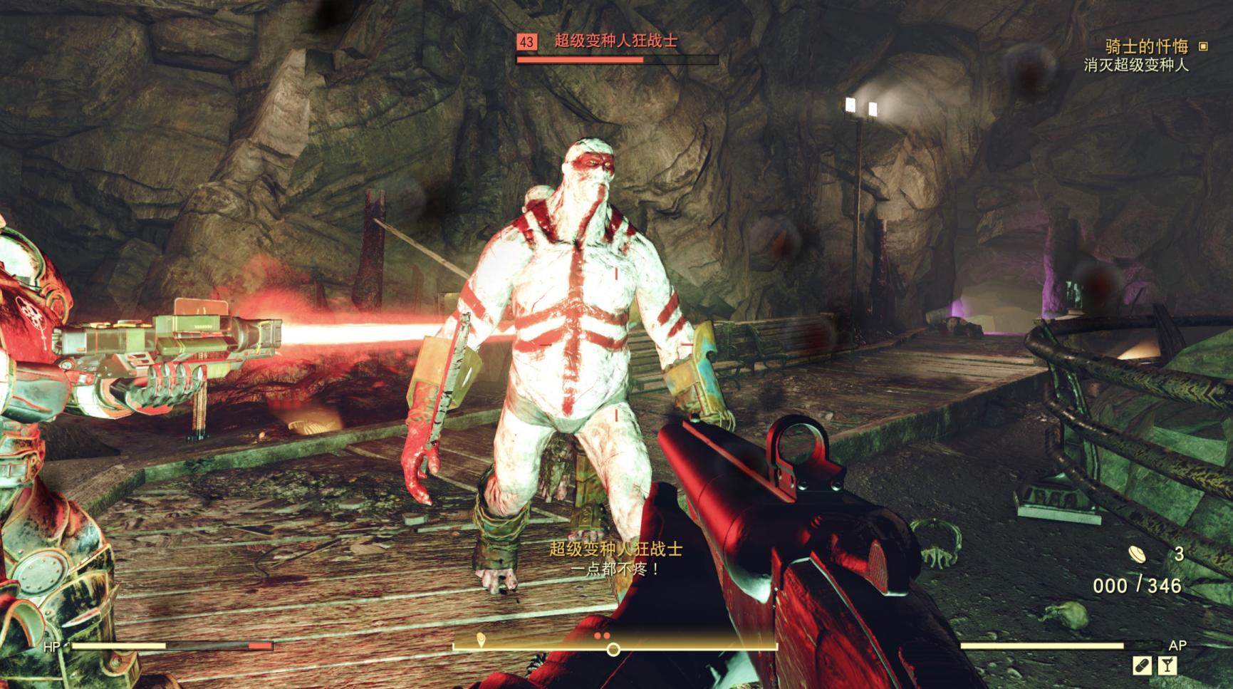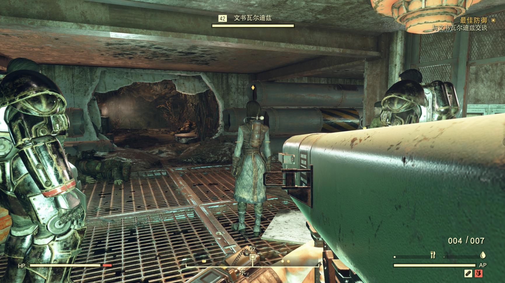 从文书瓦尔迪兹的口中得知:“基地突然遭到超级变种人的袭击,这些绿皮大家伙不知道从哪里挖掘隧道一路冲了过来,它们在子结构的墙上炸了一个洞,然后从那里发起了进攻。”要知道,我们在废土闯荡,最讨厌的东西除了吸血虫子就是超级变种人了,这群绿皮猪居然敢打到钢铁兄弟会的大本营,这还了得?!我们直接装备上风暴四筒火箭炮,并在心里暗暗发誓,见到这群绿皮猪的第一件事,直接用火箭炮轰它娘的!