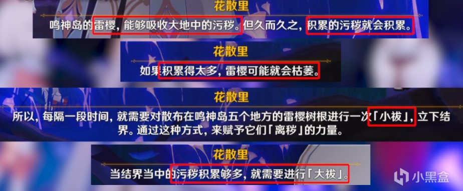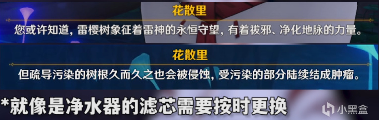 花散里告诉我们,虽然雷樱有净化地脉的力量,但是用于疏导污染的树根用久了会被堵住,这个时候就需要净化。她想要拜托我们的就是净化所有的雷樱树根。