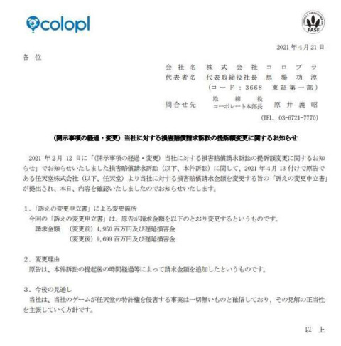 9月任天堂联系COLOPL公司并提出停止相关侵权行为的诉求,但COLOPL方面完全无视了任天堂的诉求。