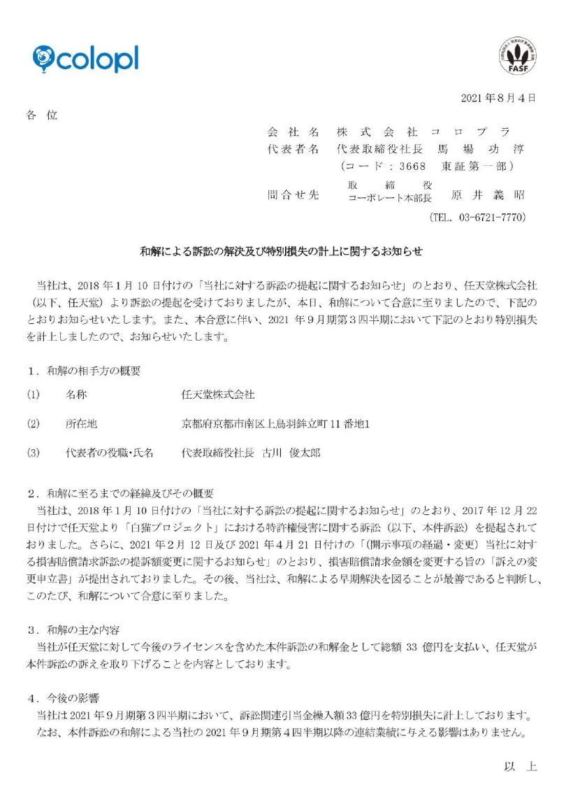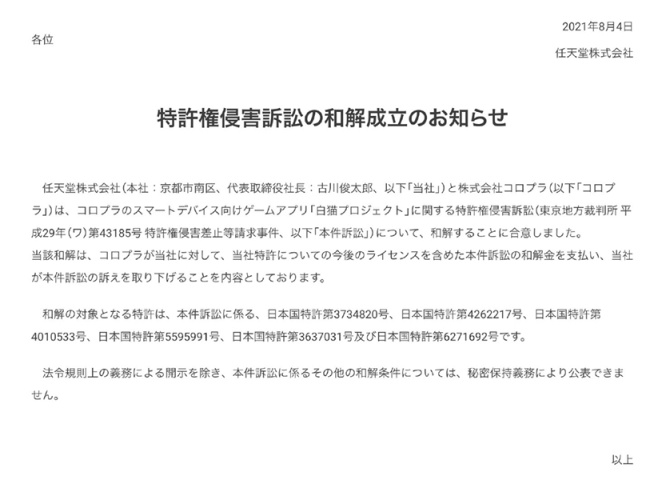 今日,这个案子终于结束,任天堂 和 COLOPL公司正式达成和解,COLOPL公司向任天堂支付 33 亿日元赔偿金,任天堂撤诉。
