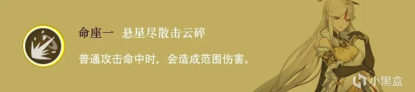 解锁1命后普攻命中会造成无伤害衰减的范围爆炸变成AOE攻击,对于日常清怪也很有用,不过1命的范围爆炸只加成普攻的两颗宝石,而不会加成重击和星璇,重击打出来的AOE是基于它本身的触碰体积,相较于1命解锁的普攻爆炸范围要小很多,基本只有在体积不大的怪非常接近的时候才能打中复数目标。这也是凝光对多目标输出乏力的原因之一。