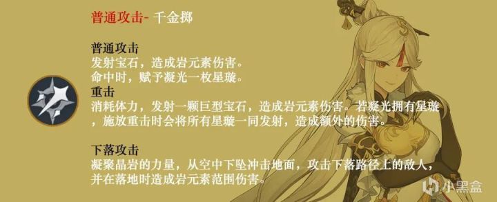 普攻发射两枚宝石攻击目标,造成岩属性伤害,并于命中时生成一枚星璇环绕自身,最多3颗。