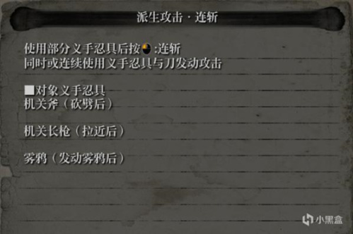 而我们可以在大部分招式途中切换忍义手但不作出任何切换动作,包括奔跑,垫步,攻击与钩锁