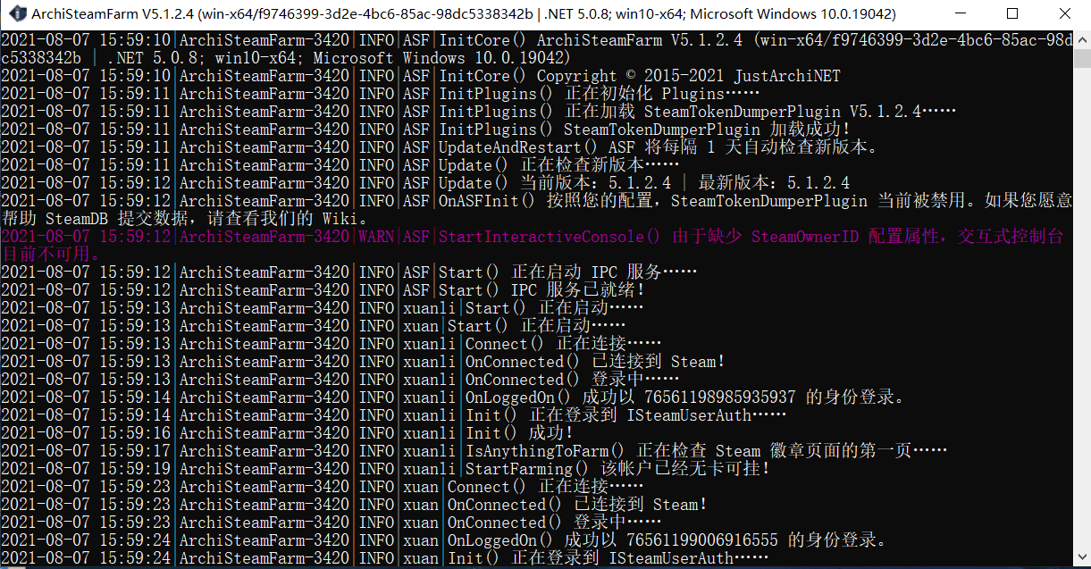 再次打开ASF时就可以挂时长了(注意是只有在所有游戏全部掉完卡以后才可以挂时长)