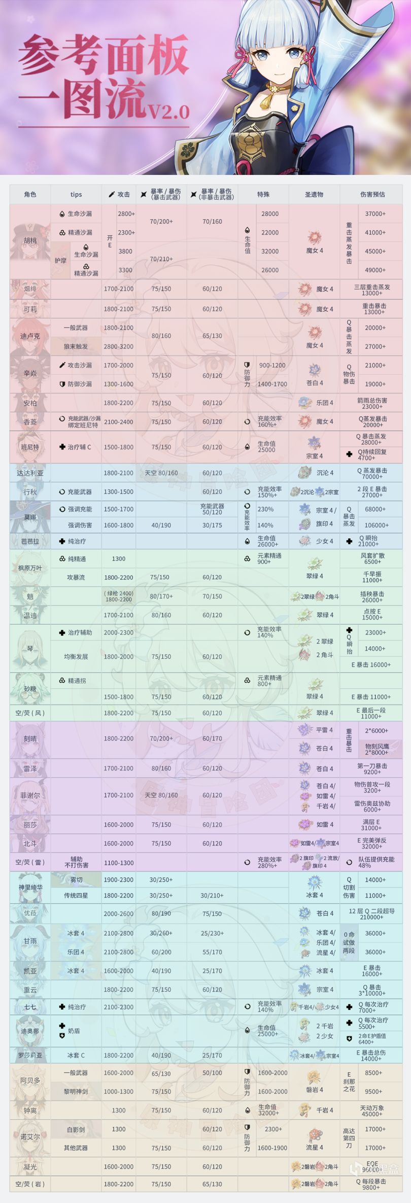 以往我们的参考面板一图流都是版本末期更新,但是收到了很多小伙伴的热情催更,而且2.0版本的新角色较多,所以计划今后每个版本都会分上下半场更新。感谢大家多个版本以来对参考面板系列的关注与支持。有霄宫和早柚版本的计划在池子开放一周后左右发布,敬请期待。