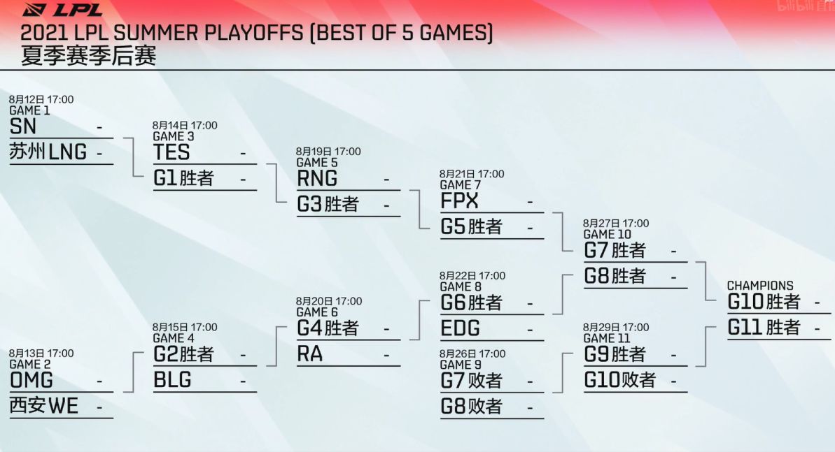 同时,官方放出了季后赛对阵图。并确定于8月12日开启季后赛。FPX、EDG、RA、RNG、TES、BLG、WE、LNG、SN、OMG获得季后赛参赛资格,最终决出的两支队伍将进行夏季赛决赛。