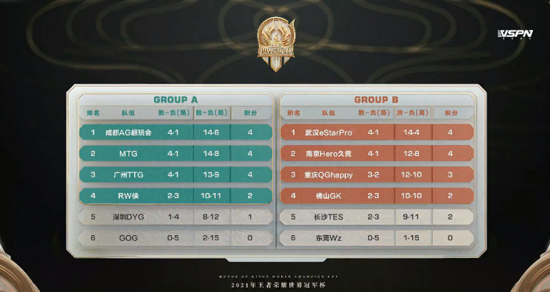 2021王者荣耀世界冠军杯小组赛积分榜