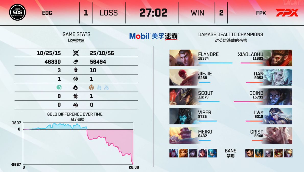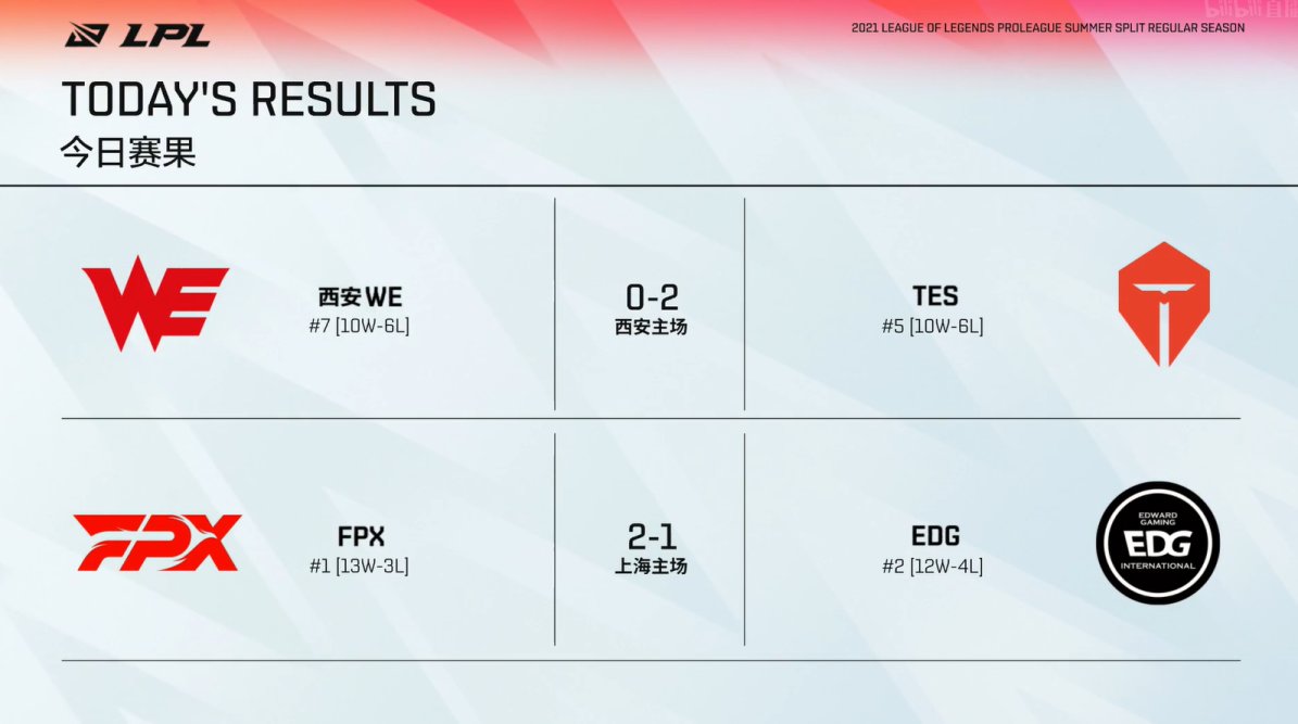 常规赛落下帷幕,FPX2-1击败EDG拿下常规赛第一。TES2-0WE锁定第五名,在FPX与EDG的第三局,全局先锋都没被捡起来过,只有先锋伤心的世界形成了(doge)