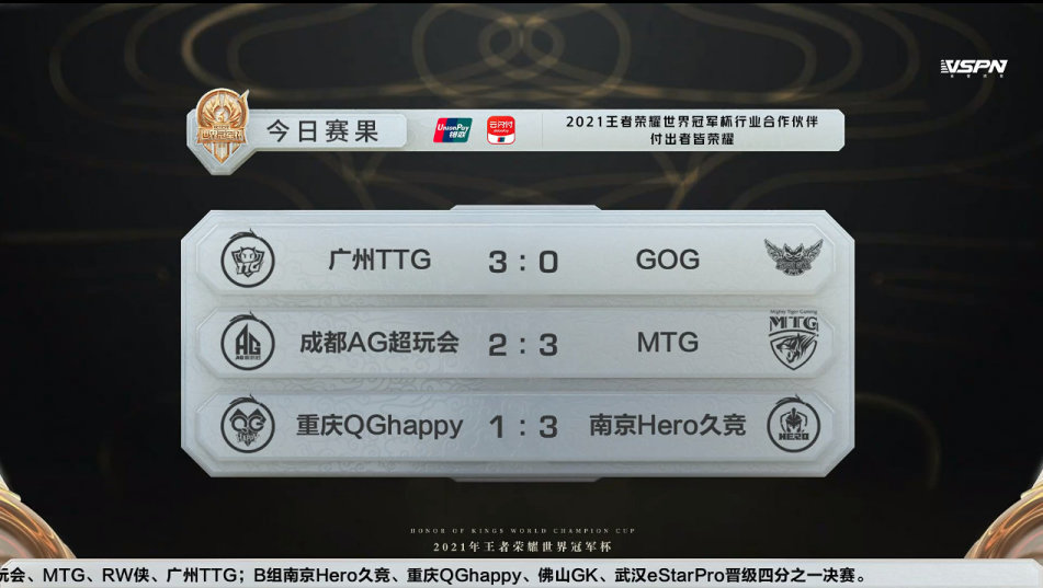 王者荣耀2021年世界冠军杯小组赛已全部结束,本日广州TTG3:0碾压GOG, AG2:3憾负MTG,凭借小分位列A组第一,QGhappy状态起伏不定,1:3败给HERO, HERO反超占B组第二