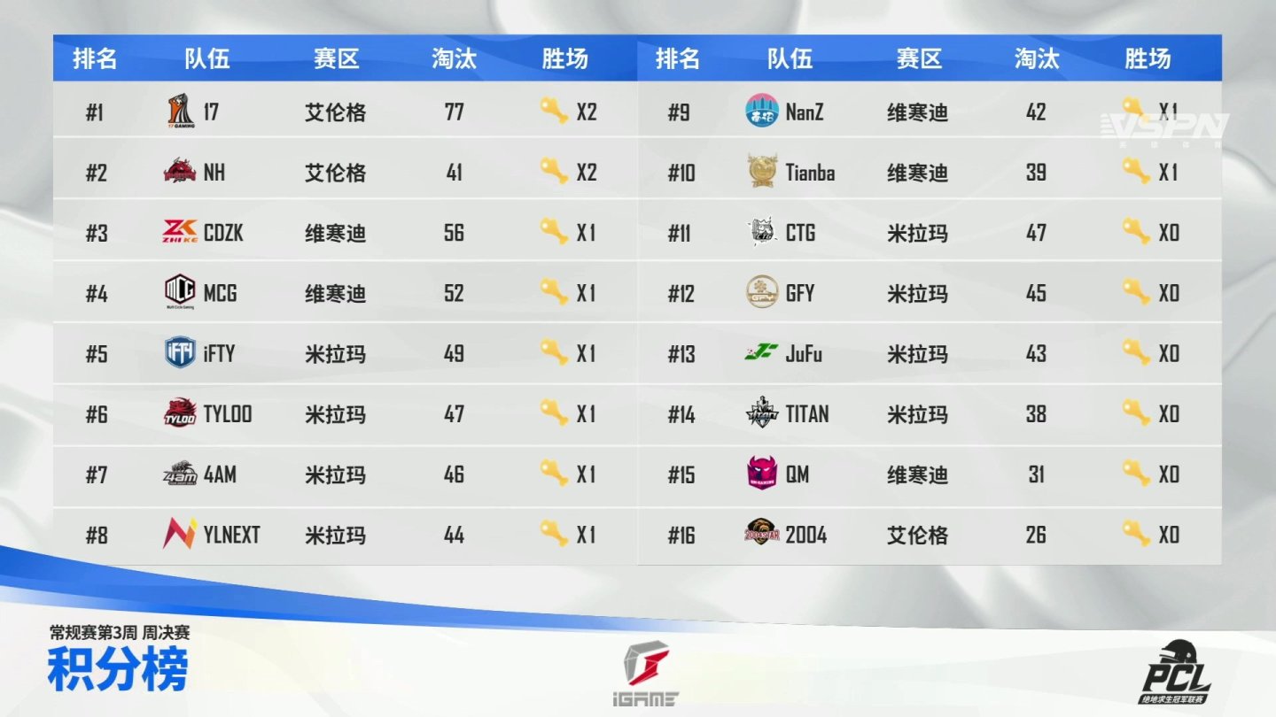 17Gaming继续遥遥领先,淘汰数远超后续队伍下