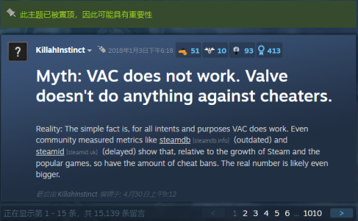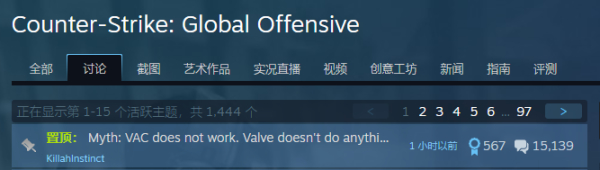 我们在steam的社区-讨论-CSGO板块就能看到V社第一条置顶 谬论:VAC无法工作,V社没办法惩治作弊者,置顶的目的也是回应玩家们对VAC工作效率的质疑。