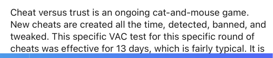 新的作弊方式总是被创造出来,被检测到,被禁止,被调整。这种特定的VAC测试对于这一轮作弊是有效期是13天,这是相当典型的,他现在不在活跃,因为作弊开发者已经通过操纵他们客户的机器(作弊者)的DNS缓存绕过它。
