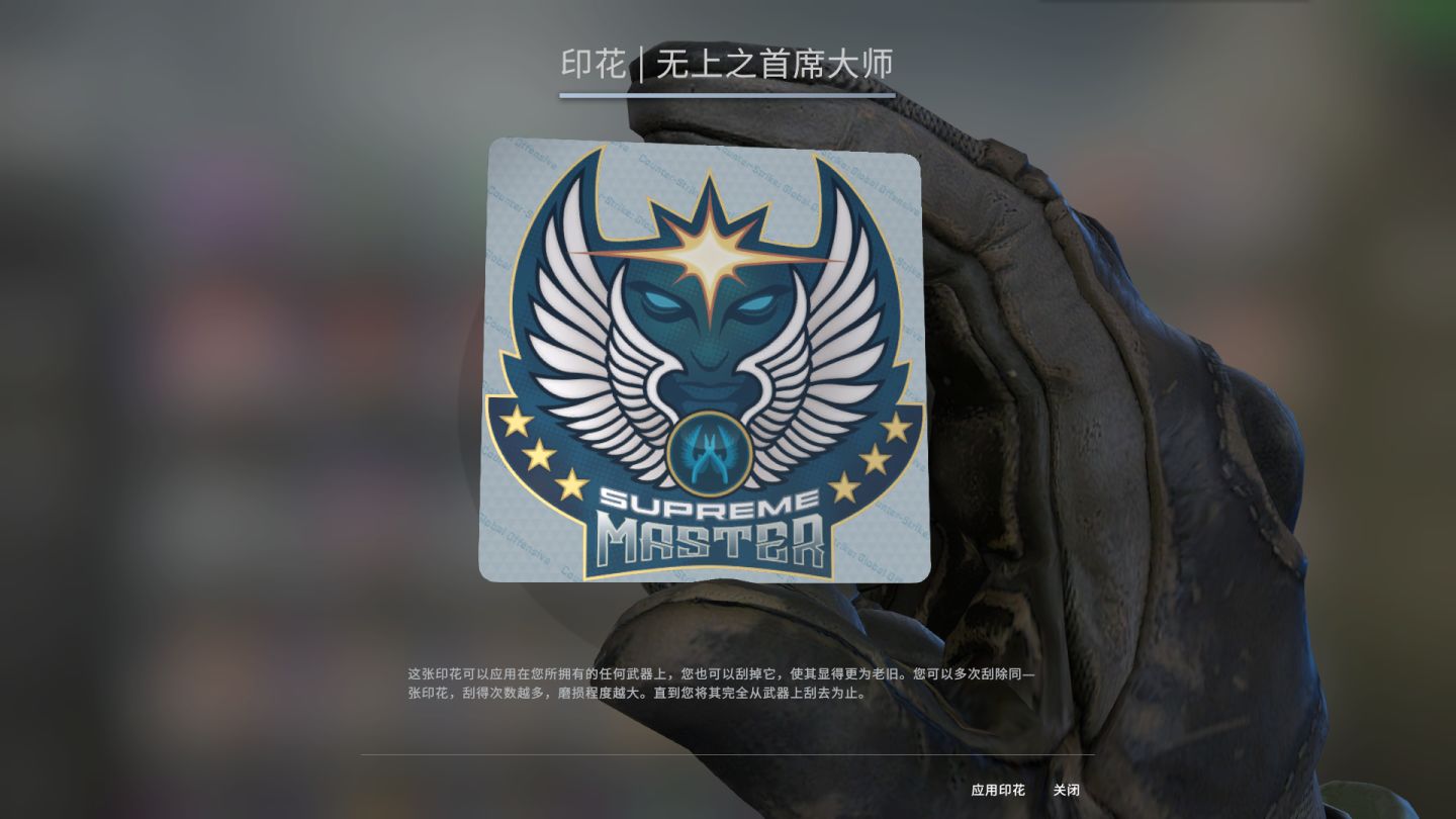 对应段位:小地球。中间是一个人像,左右两边有一大一小两对翅膀,翅膀下面左右两边各有3颗五角星,人像下方是一个CT的“钳子”logo,再下面是英文“SUPREME MASTER”(无上之首席大师)