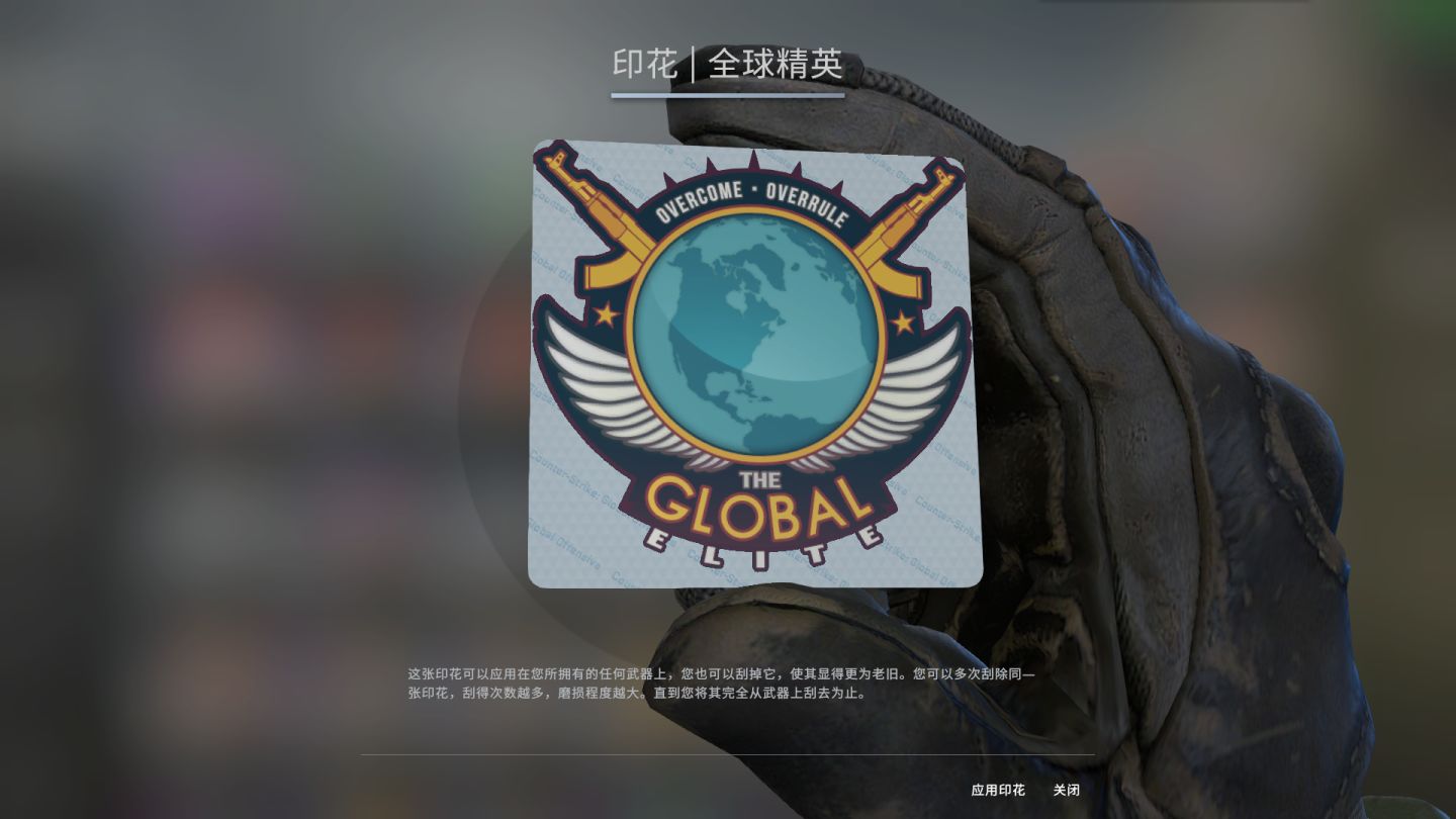 对应段位:大地球。中间一个大地球,左上角和右上角各有一把AK47,下面是一颗小星星,然后是一对翅膀。上方英文“OVERCOME•OVERRULE”(克服困难,支配一切),下方英文“THE GLOBAL ELITE”(全球精英)