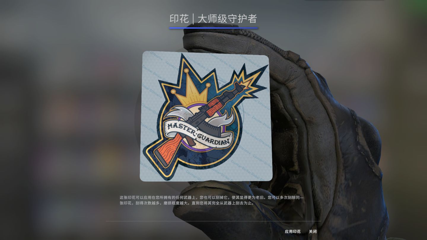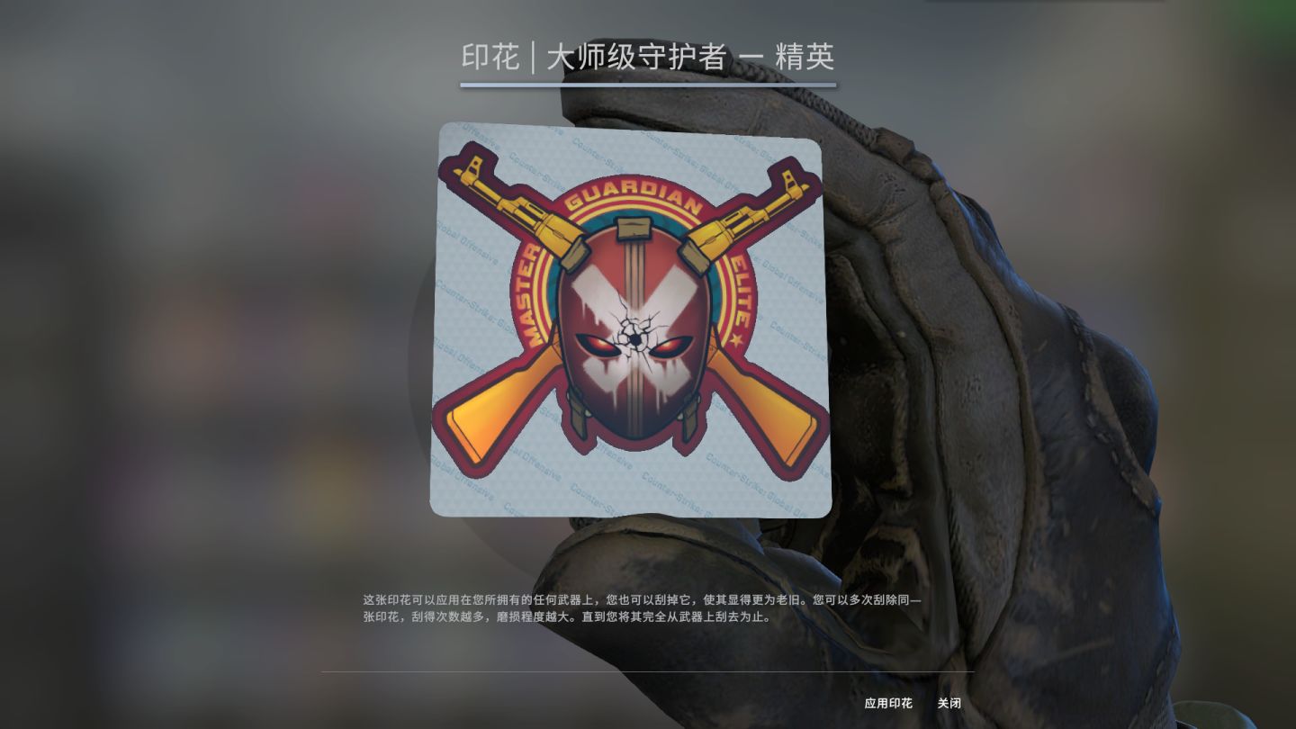 对应段位:双AK。中间是一个在大行动时候会出的一个重甲兵的面具,在面具的背后两把AK交叉放置,周围一圈“MASTER GUARDIAN ELITE”(大师精英级守卫)的字样