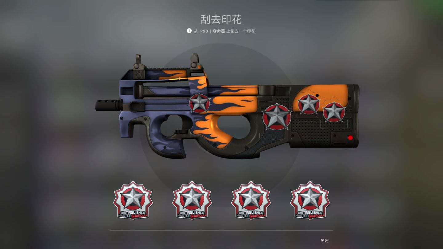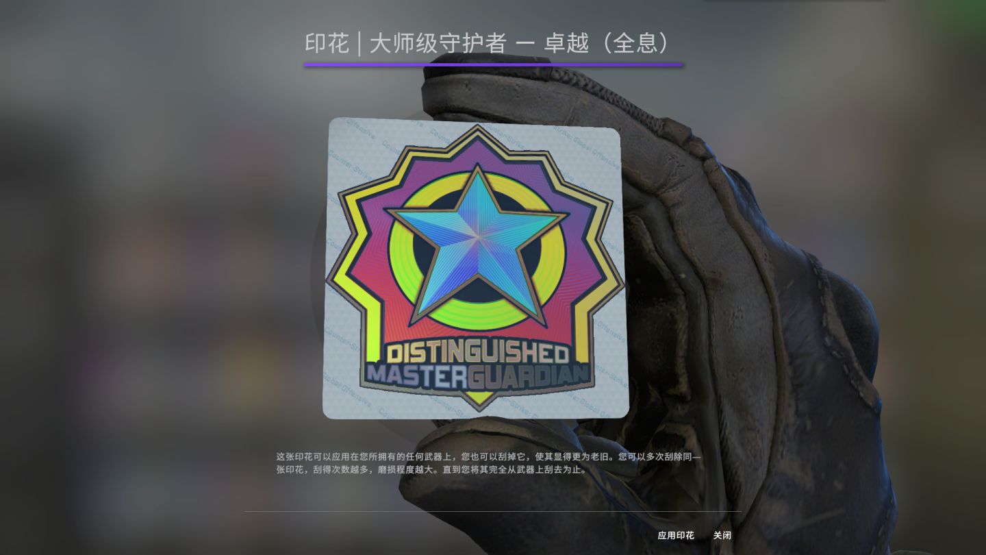 对应段位:菊花。由红蓝白三种元素构成,中间是一颗五角星,外面包着圆形。下方英文“DISTINGUISHED MASTER GUARDIAN”(杰出大师级守卫)