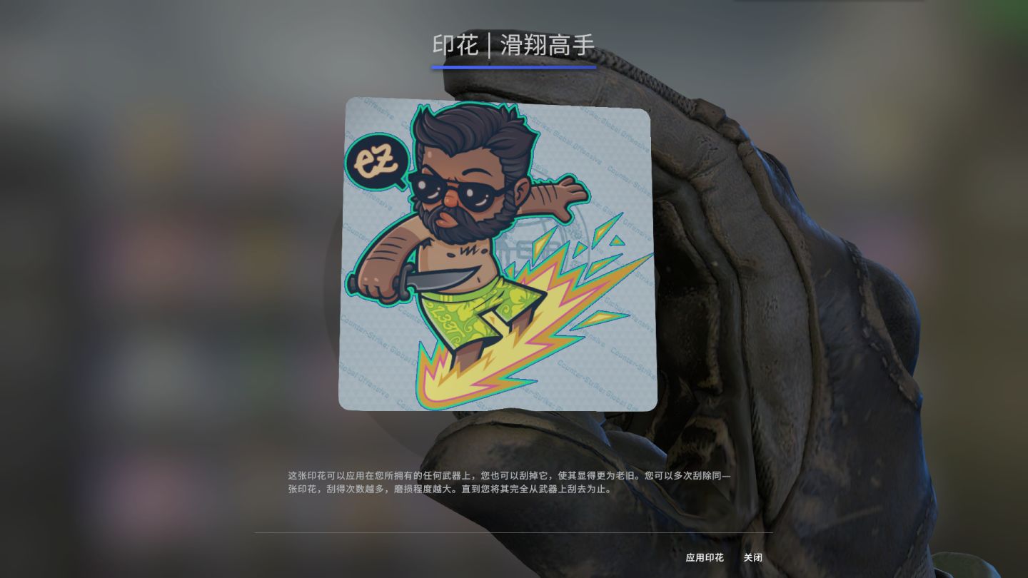 刮过之后墨镜上出现了“cs”字样,手臂上出现了纹身“SURF IT”(冲浪),脚上出现了两根骨头,匕首上出现了“20YEARS”字样,原来嘴里哼着的“ez”下方也出现了“Twenty”字样。该印花为CS20周年系列印花,以此来纪念CS的20周年。