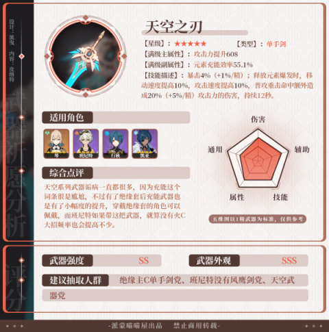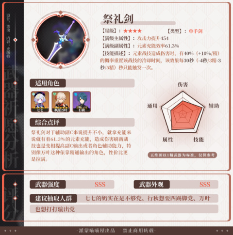 祭礼剑一直是副C行秋,奶妈七七的首选武器,重置元素战技来提高伤害或者辅助能力,性价比很高,1.6更新之后万叶C也是可以用的,个人推荐最少要拥有一把精5的祭礼剑,这样可以很大程度的提高队伍总体性,性价比很高很值得抽。