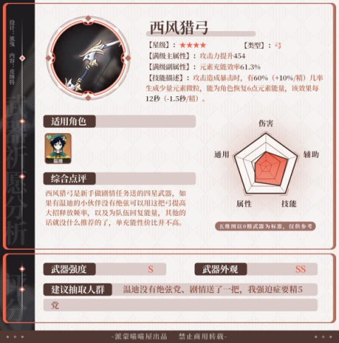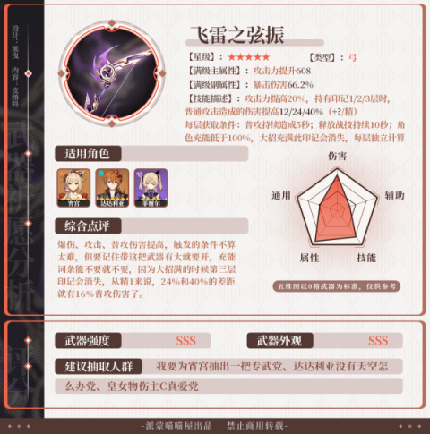 2.0稻妻新增五星暴伤弓,但局限性很大,基本上只有需要普通输出的角色才可以使用,类似甘雨这种重击输出的角色几乎等同于一把暴伤弓没有其他加成,而相性最好的莫过于是宵宫了,想要宵宫主C的玩家这把武器是不容错过的哦,当然前提是口袋满满!
