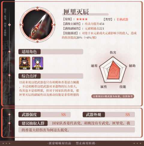 是的你没看错,又是它,匣里灭辰它又回来了,胡桃如果没有抽到护摩的,或者香菱少一把副C武器的可以适当抽一抽,道理我都懂,但为什么又是它?