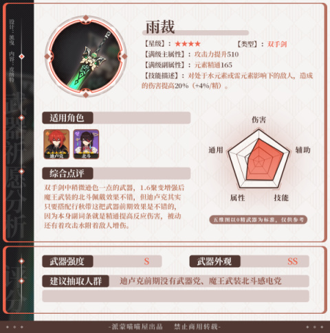 雨裁(cái)这把武器实用性其实一直很低,副属性精通目前只适合迪卢克主C使用,而且前置条件是几乎捆绑行秋,不过如果迪卢克主C一般情况下都带行秋所以这把武器是你想打反应高伤害,不想抽狼末还不想氪金买大月卡武器的最好选择,收益和性价比真的很高。