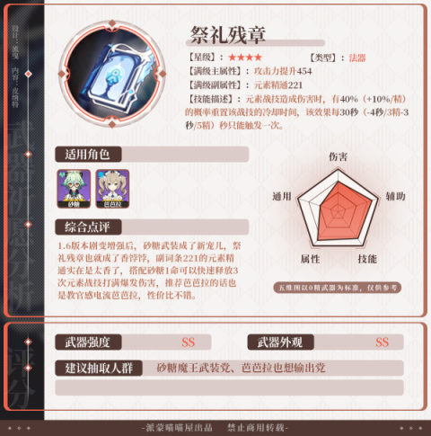 聚变增强后祭礼残章的收益要比之前砂糖单纯聚怪好上很多,主要是这本书的精通加成很高,砂糖武装武器首选,其次就是芭芭拉感电流这把武器单纯提高精通也还算不错吧,毕竟四星武器,砂糖和芭芭拉都不太需要高精可以看需求抽取。