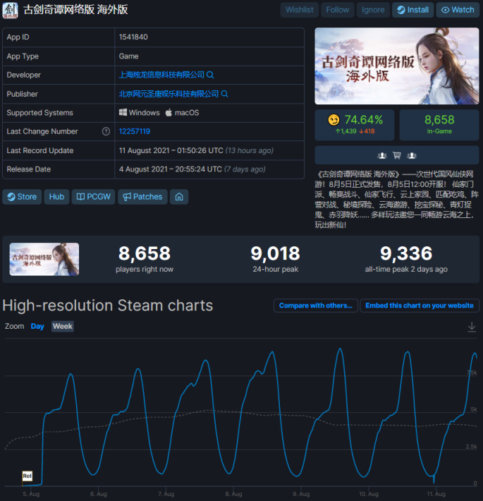 实际上,古剑当初海外开售才3天时间,尽管售价高达39.99美元起,也被外国玩家们买了20多万套,而国区基础定价才68元,完完全全的买断制,并且官方承诺永不售卖影响游戏平衡的数值类道具。承诺永不设VIP,和同类型的mmorpg相比,实在很良心,游戏的好评率也有所回升,基本稳定在多半好评(77%)。