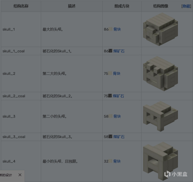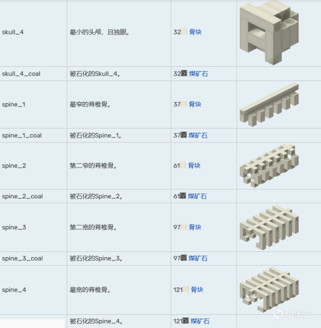 化石结构是在沙漠、沼泽与它们的M和山脉变种生物群系的地下15–24方块处生成,每个区块有1⁄64的几率生成。由煤矿石与骨块组成,外形类似于大型已灭绝生物的头颅和脊椎骨。头颅有4种变种,脊椎骨也有4种变种。