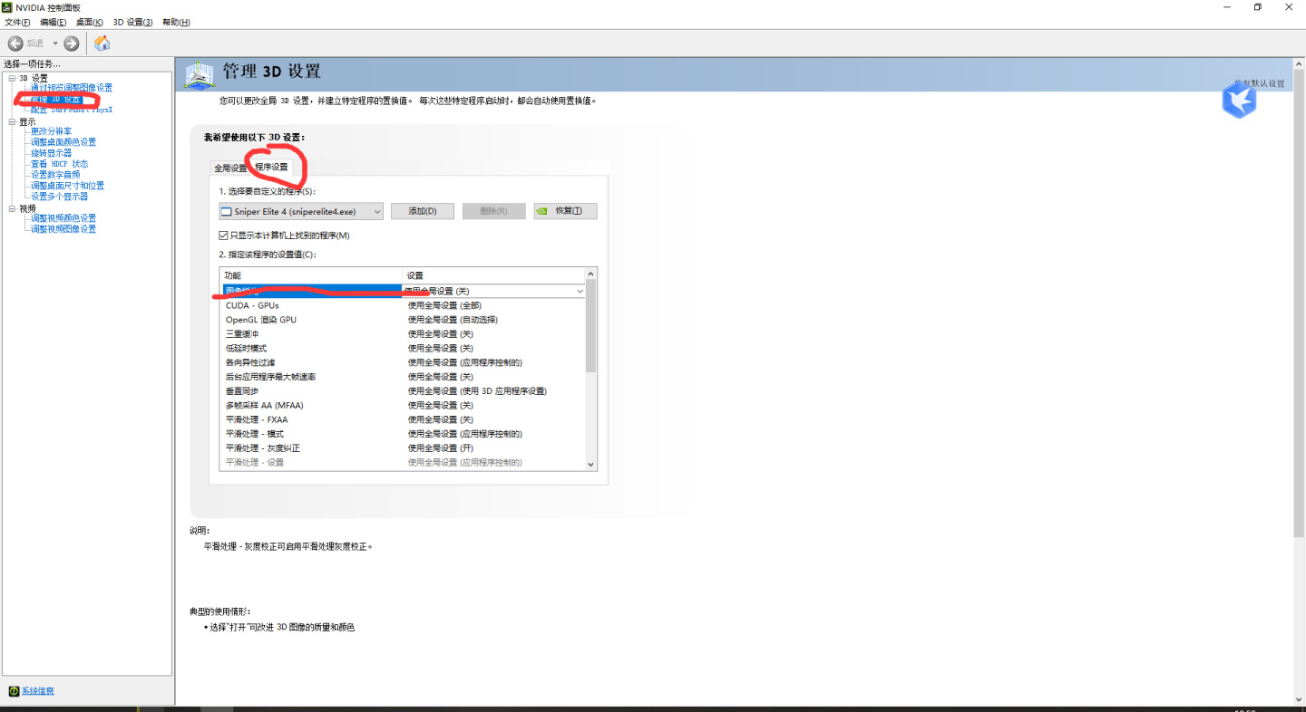 找到左侧的“管理3D设置”,然后找到程序设置,并添加自己想要增加画面清晰度的游戏