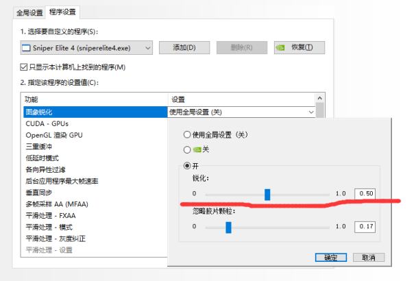 之后,将“图像锐化”设置为开,并将锐化拉高至0.64-0.78(可根据自己需要酌情增减),之后点击“确定”,并点击“应用”(注意,千万别没点应用直接关闭界面)。全局设置完后必须重启游戏才能生效。