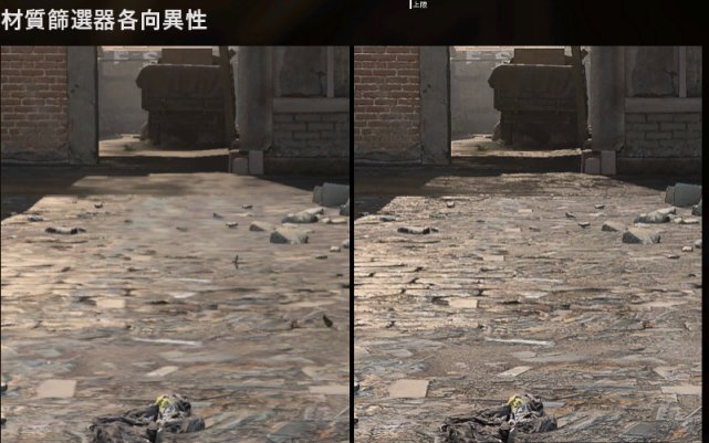 为了缓解图形的模糊感,可以开启“各向异性过滤”选项,在开启后,靠近镜头头一侧的平面纹理将变得更加清晰,且开启数值越大,清晰的范围越大。