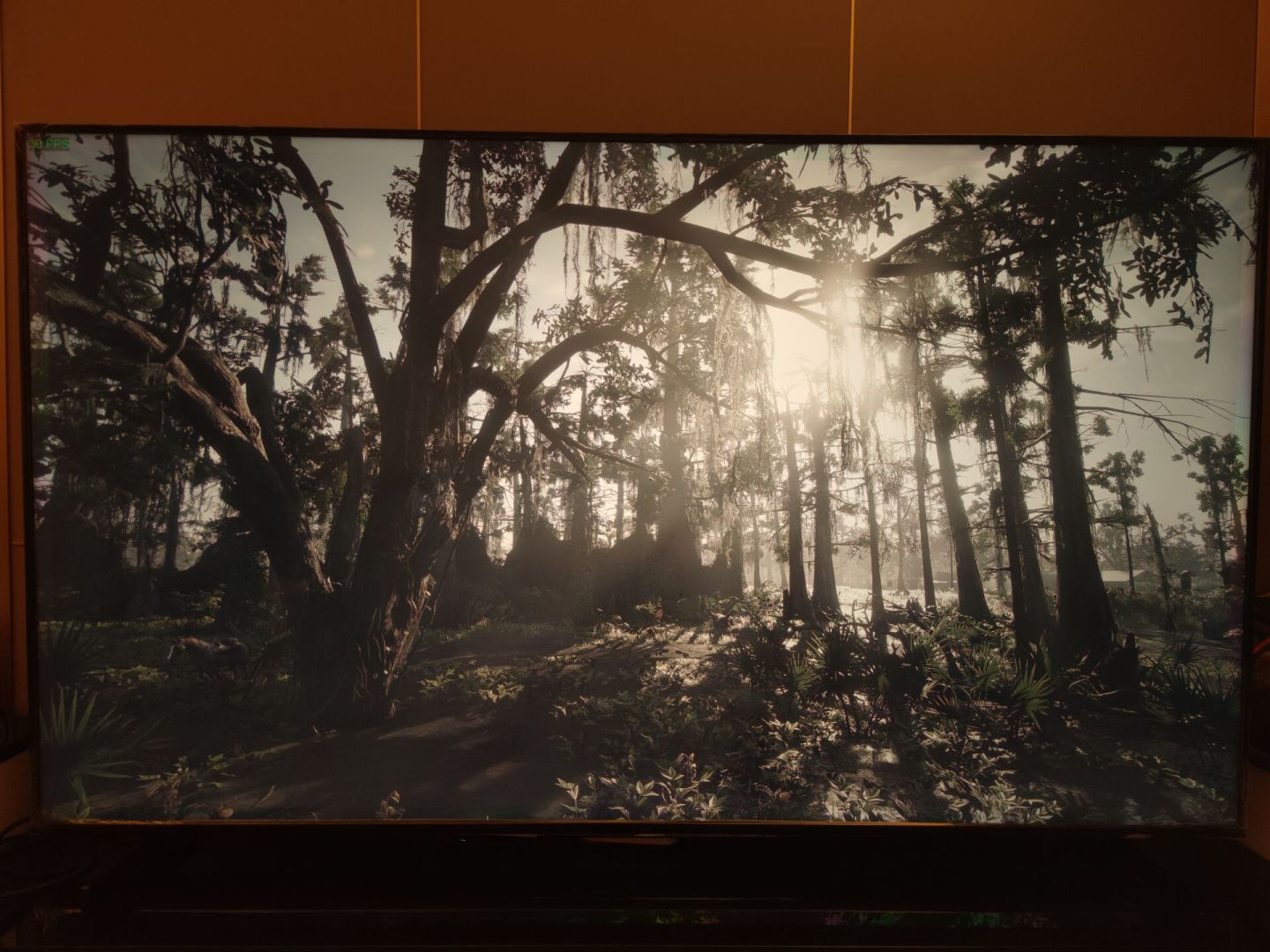 在讨论这个复杂的问题前,作者先给大家看两张图。上图是作者在游玩时顺手截下的游戏截图,下图是实际游玩时的屏幕实拍,由于上传图片大小不能超过4mb,两张图已经经过压缩,所以实际画面会更好。这是在4k画质下,画面选项多数拉满,且能在锁30帧做到稳定不掉帧的实际画面,大伙儿猜猜这是什么显卡,欢迎讨论。