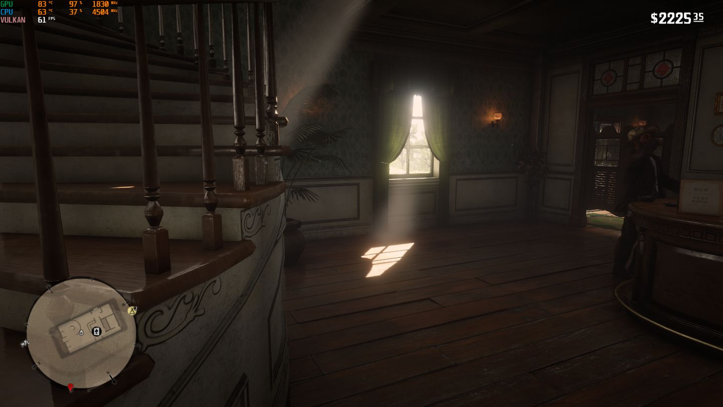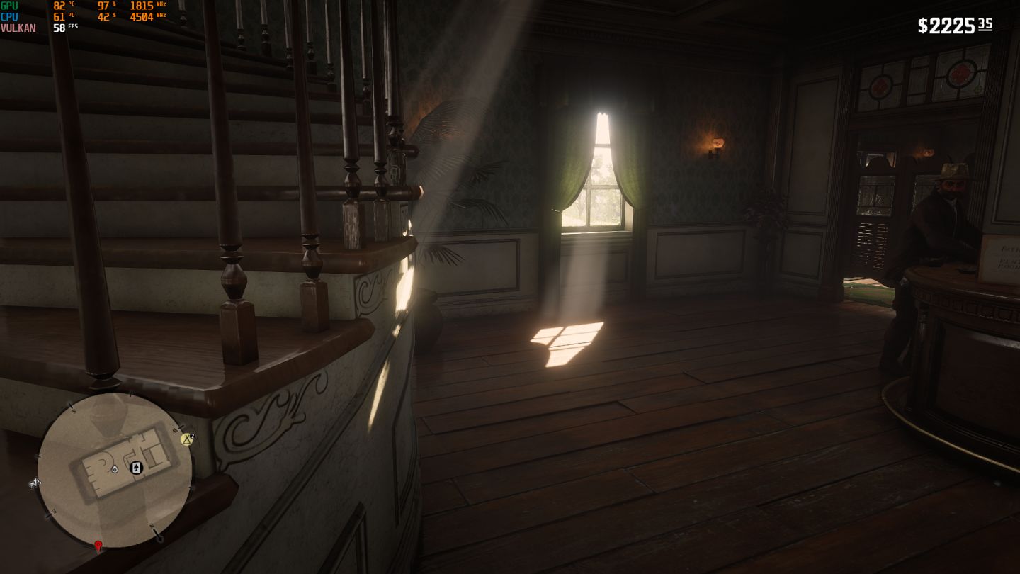 在充满灰尘的室内环境中,可以看到窗户透下的光线立体感明显不同。在室内,由低调至超高不会有明显的帧数下降。