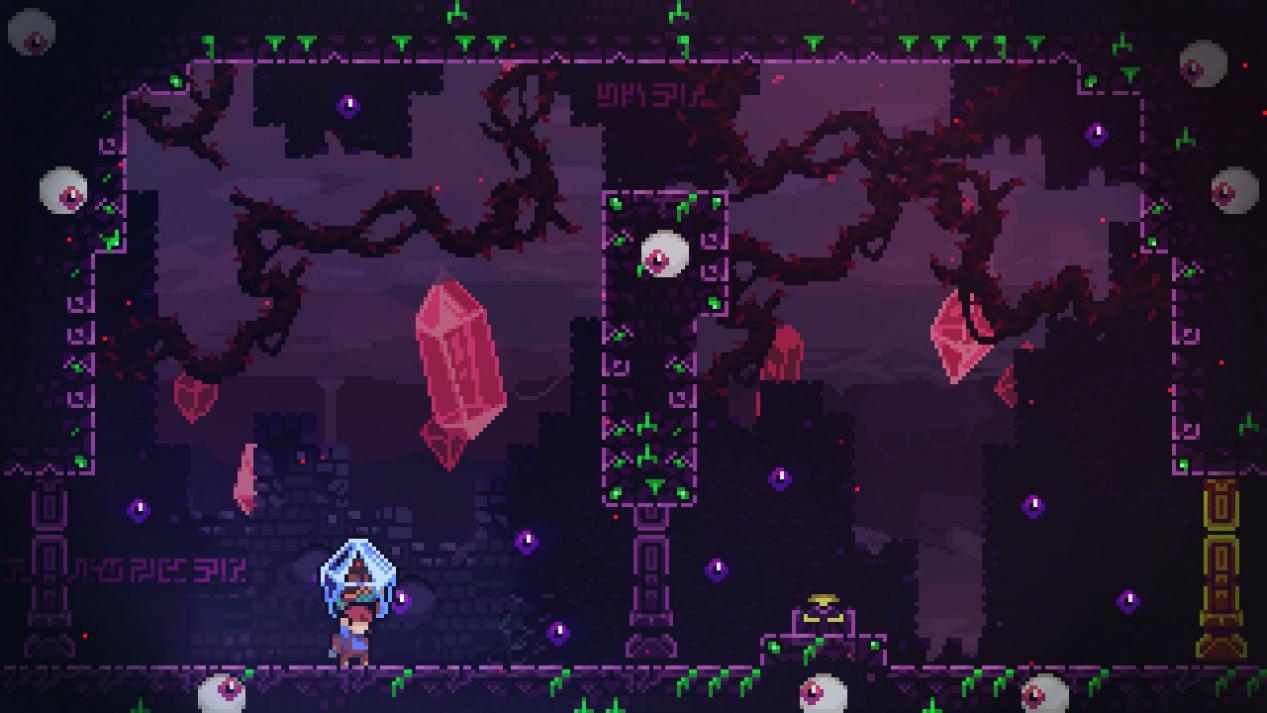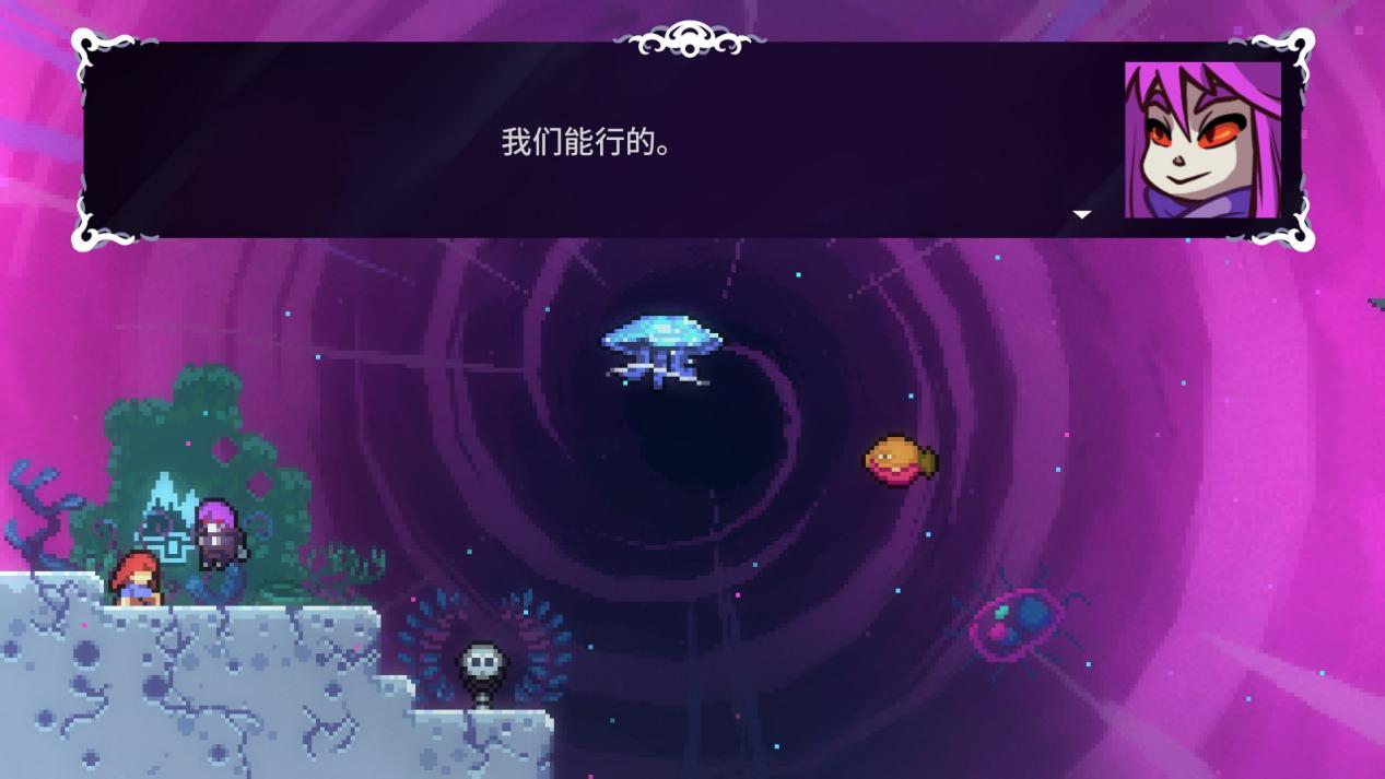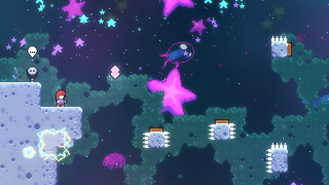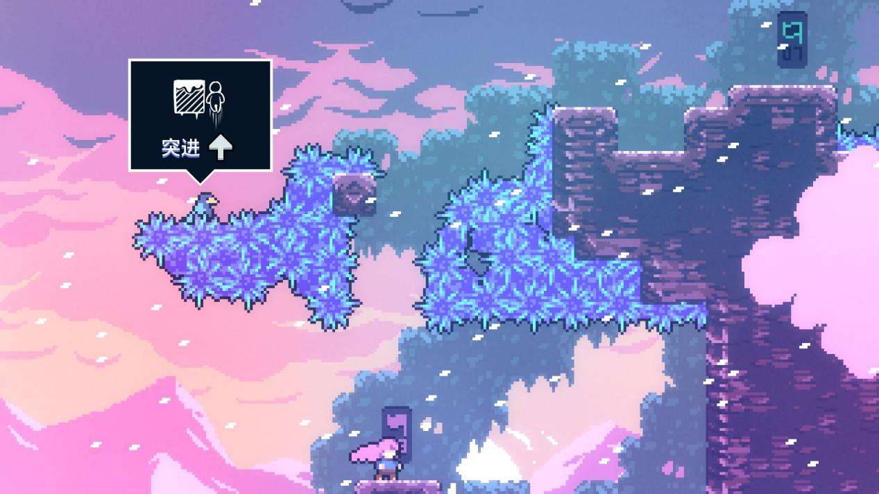 最后谈谈动作和地图要素产生的互动,地图元素对玩家动作的影响无非两种——跳得跟高/跳得更远,我相信大部分玩家在流程中都会注意到部分细节设计,拿8A的小怪来说你需要踩小怪头来提升自己的高度,如果你只操作方向键只会上升一点高度,但你在踩头的瞬间按跳会有明显的高度提升。8A的绳子按住被甩飞会上升一段距离,但你在到顶点之前的一瞬间松手跳会飞出更高的距离。官方告知的出果冻跳就是最好的样本,面对同一个环境要素你的处理方式不同会有不同的后果,还有更多的元素等待玩家去发掘。这些细节设计有助于选择最佳路径,《蔚蓝》的每个落点都是精心设计,如果你做出作者想要的正确操作就会恰好落在平台上,当然你也可以借助这些要素完成某些速通偷鸡,这些细节操作令《蔚蓝》拥有无限可能。