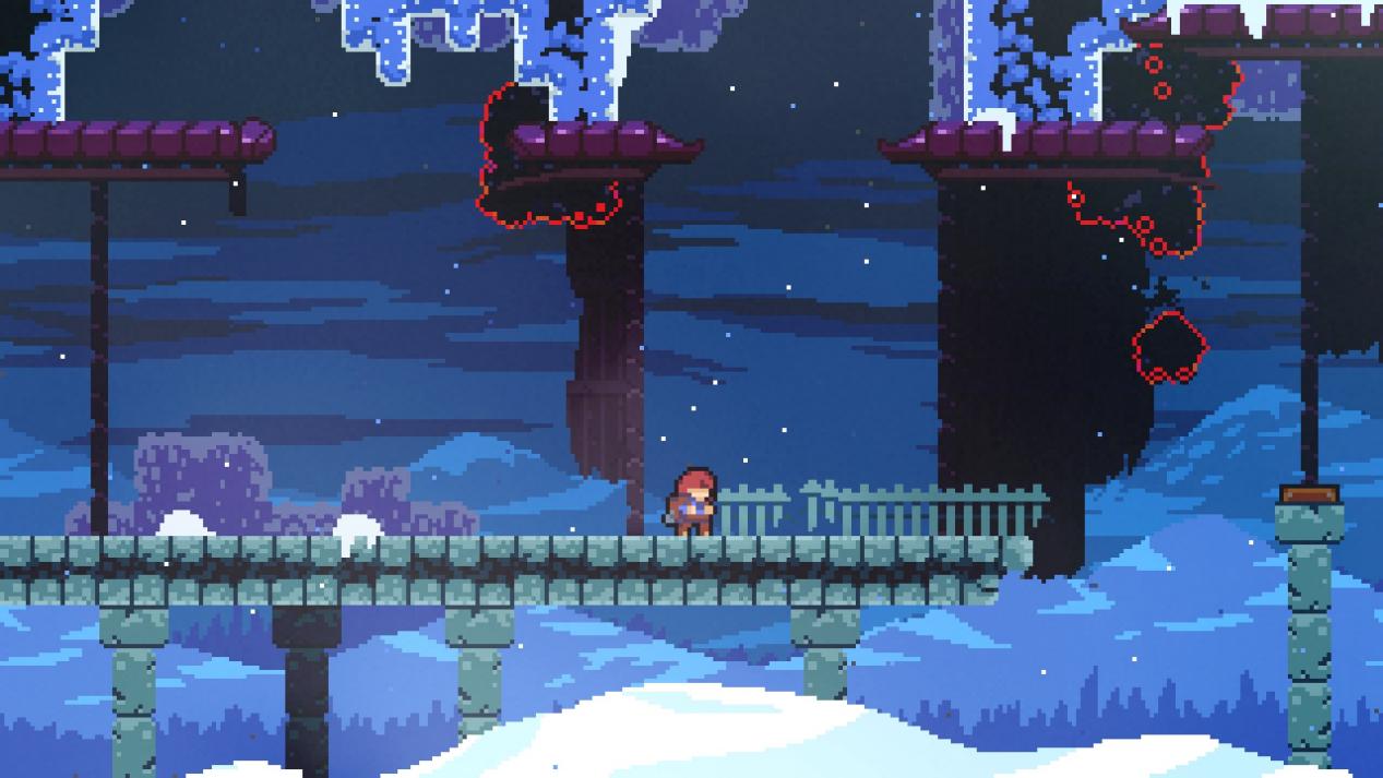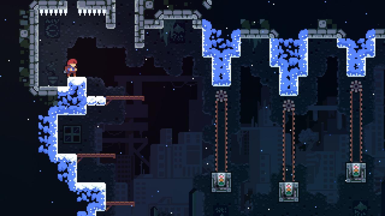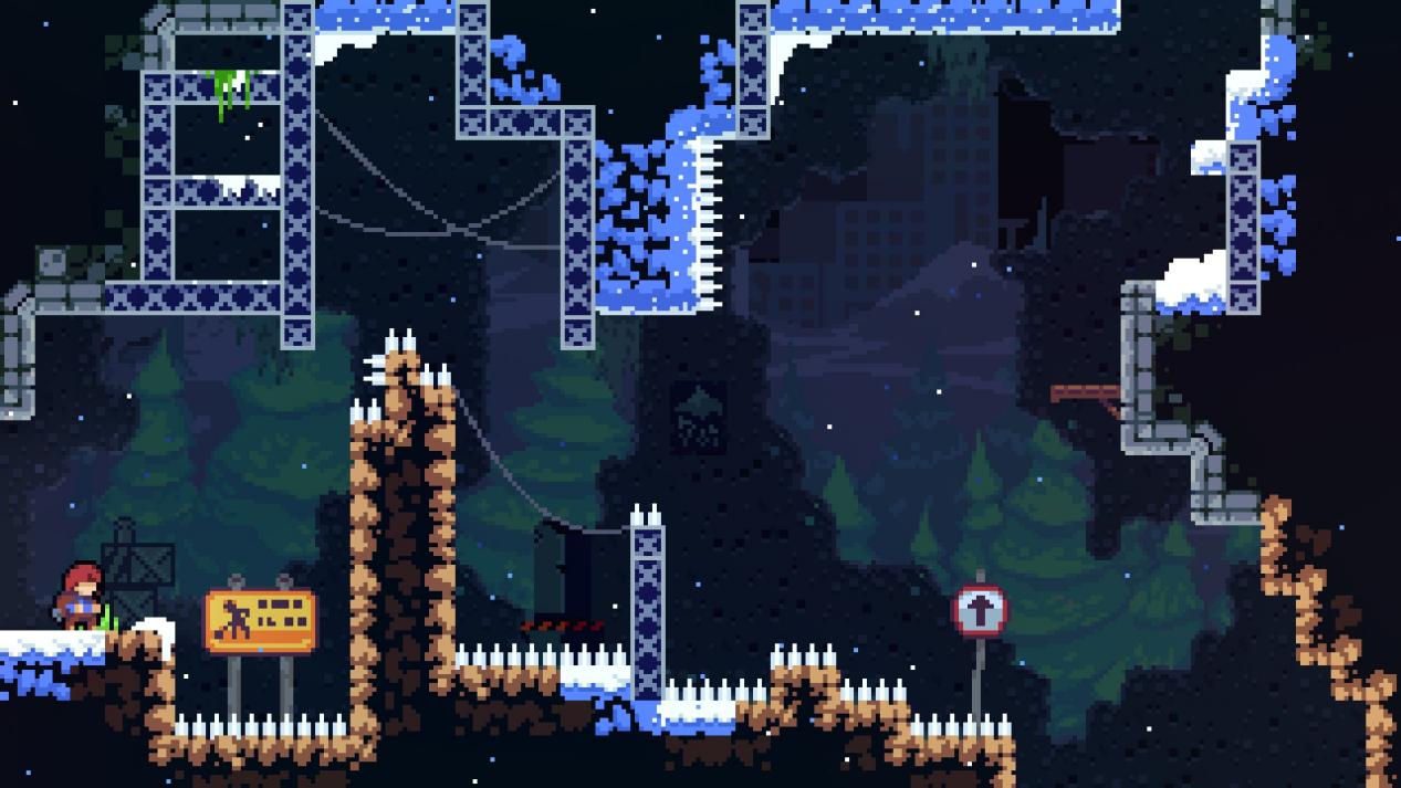 你以为《蔚蓝》的版面只是数量多那就大错特错了,《蔚蓝》每个章节都会有相当多的独立环境元素,第一章的缆车、第二章的果冻、第三章的菌丝、第四章的雪风还有第八章的双态变换等等,从一到九章每个章节从陷阱到敌人到独特机制都进行了完全的翻新。毫不夸张的说《蔚蓝》的每个章节拆分出去都是一款成功的独立游戏。传统的平台跳跃游戏在能力获取完毕后会迎来一个关卡设计的阈值,大部分制作组都选择把陷阱换换位置就敷衍了事,这个关用冰刺、下个关就挖个坑。《蔚蓝》每过一关就把整个地图完全翻新一遍,仿佛自己进入了一个全新的游戏。