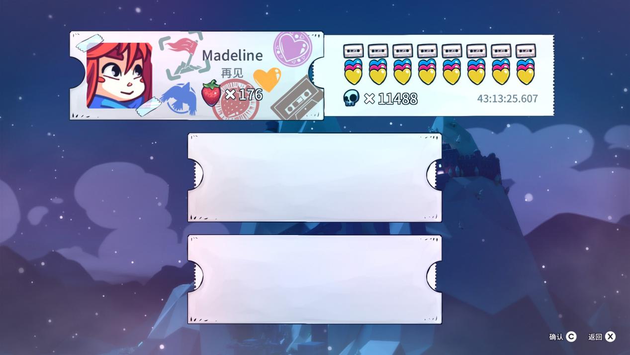 游戏的难度曲线从低到高大致是1A—7A——1B—7B——8A—8B——C面——第九章,A面总体简单但还是有几个草莓搜集的难点,如果你决心完成游戏一般都需要重打一次1到7A拿到全磁带和全草莓,在这个过程中你可以学会版边跳跟冲刺进版跳。玩家已经知道大致路线和操作,有了经验后全搜集的流程也不会太过痛苦。
