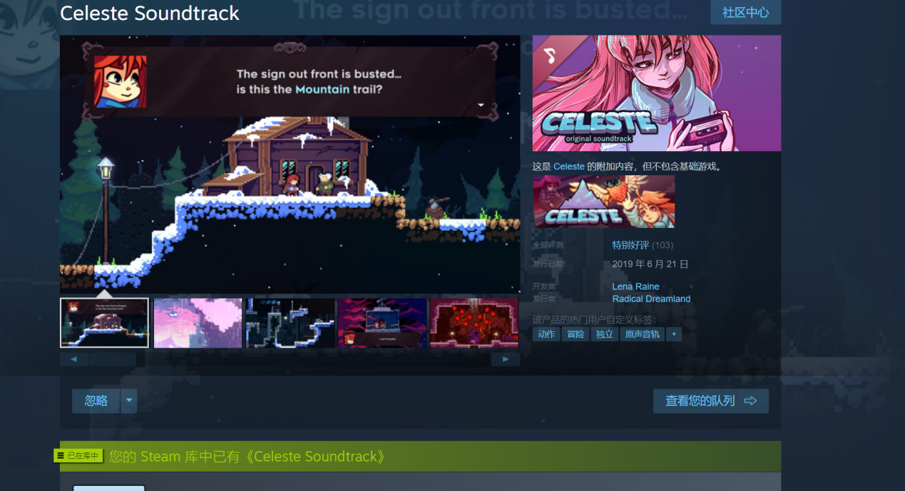 作为独立游戏来说画面的分量要看游戏的类型,画面对于平台跳跃游戏来说影响不小,尽管画面不会影响游戏质量但平台跳跃游戏相当畏惧玩家精神上的疲劳,如果你的关卡全是那种万年不变的阴暗地牢图景显然不利于刺激玩家的大脑。《蔚蓝》不同场景的风景都有强烈的色彩对比度,看起来就容易保持新鲜感。另外游戏光A面就有21首歌曲,根据主题的不同会有不同的音乐,钢琴曲和电子乐交相辉映,《蔚蓝》不光是好玩还兼顾了好看和好听。