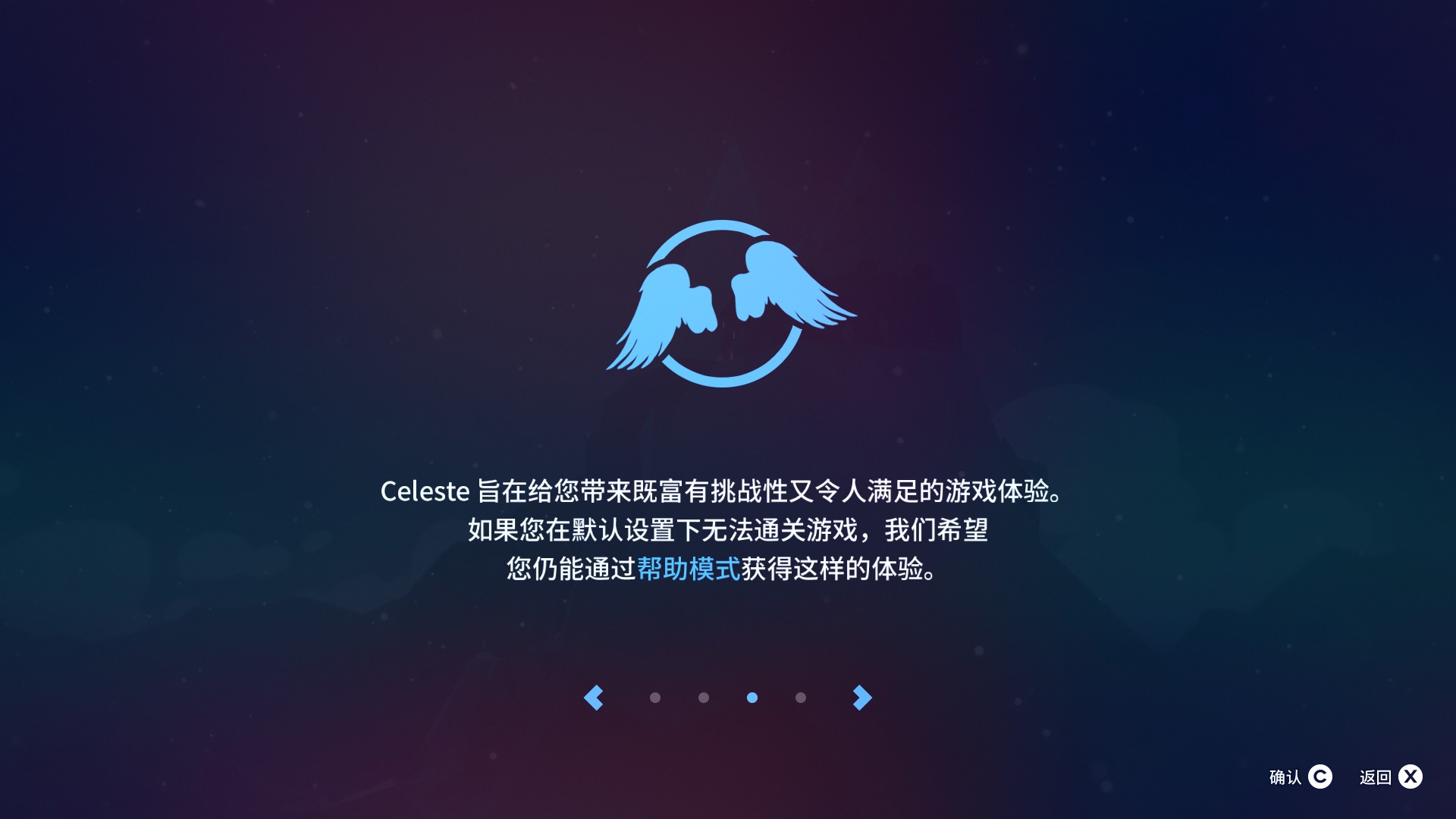 大部分人可能对《蔚蓝》望而生畏,其实《蔚蓝》的A面相当简单,不需要任何进阶技巧就能通关,在全草莓搜集的情况下我仅死了两千出头,其中大部分都是因为搜集草莓死亡,如果不去搜集草莓磁带1A到7A可以说几乎毫无难度,当然这是因为我玩过不少平台跳跃游戏。作为纯初心者1A至7A还是有些难度但不至于无法克服,而且你可以选择开启帮助模式,来获取多次冲刺等能力来帮助自己通关。