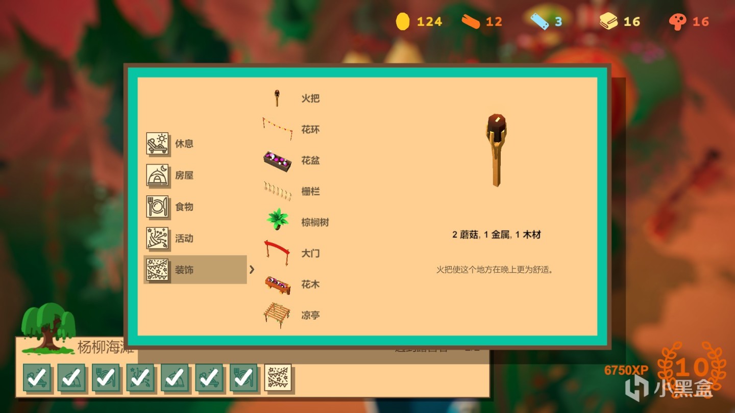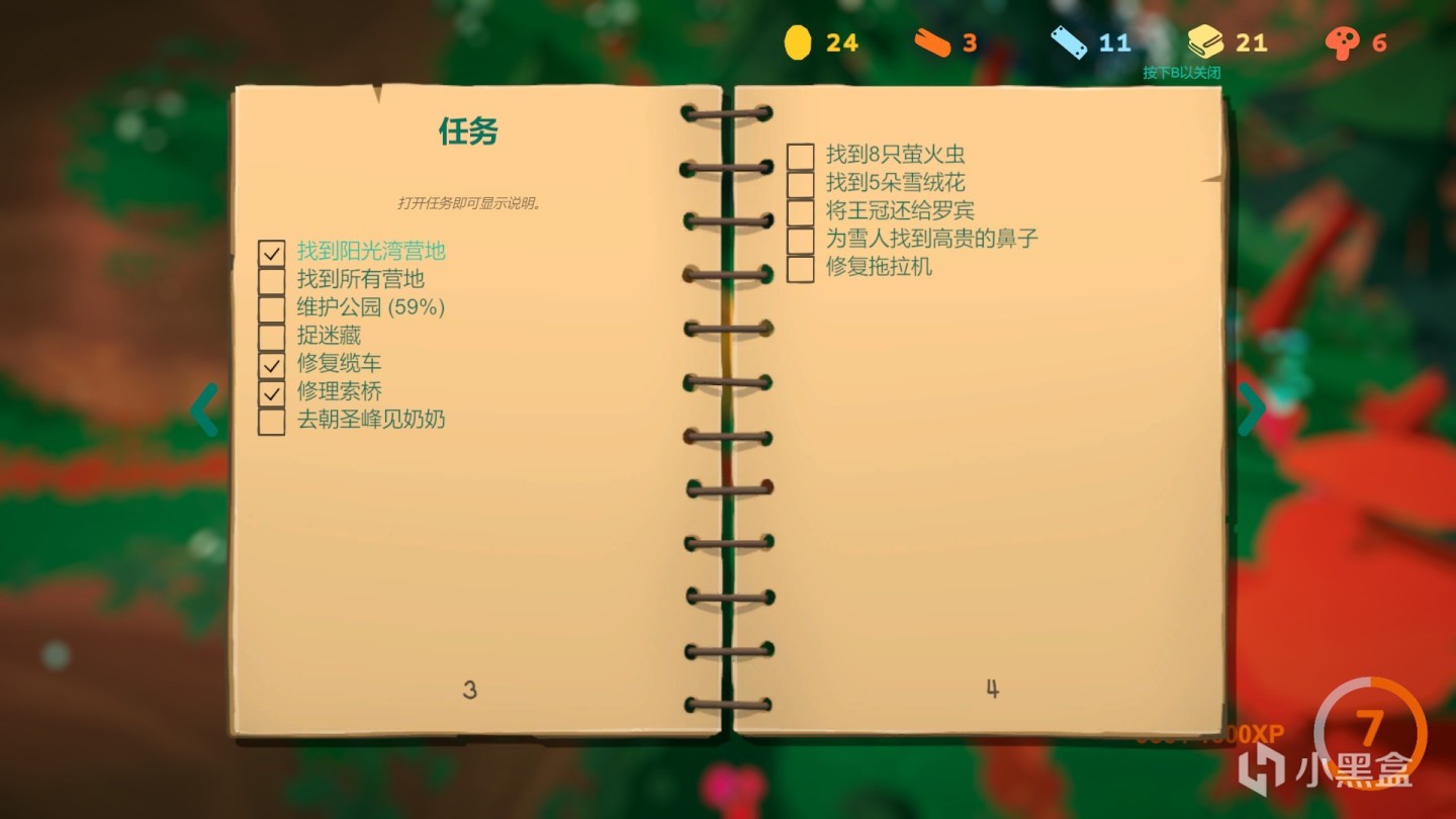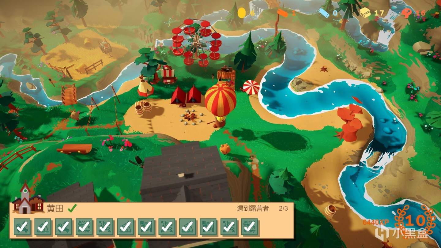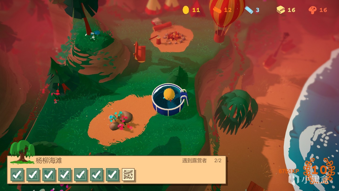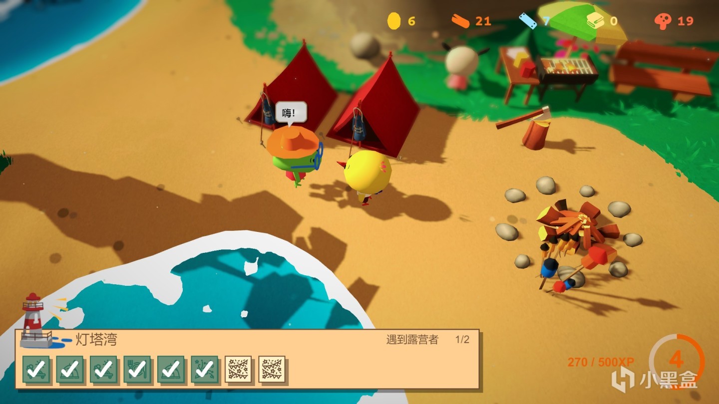 野外探索分为两个环节。其一是日常资源收集,木头,钢材,布料和蘑菇是基本的四种资源,可以用来建设营地或是修复公园设施。夜晚有特殊资源萤火虫,可以用于点灯。金币也可以在野外拾得,解锁市场后可以以一定比例交易日常资源。其二是一些任务需要在野外完成,例如NPC的捉迷藏任务和登上废船残骸的成就。这些在地图上都没有明显指示,需要玩家慢慢探索。