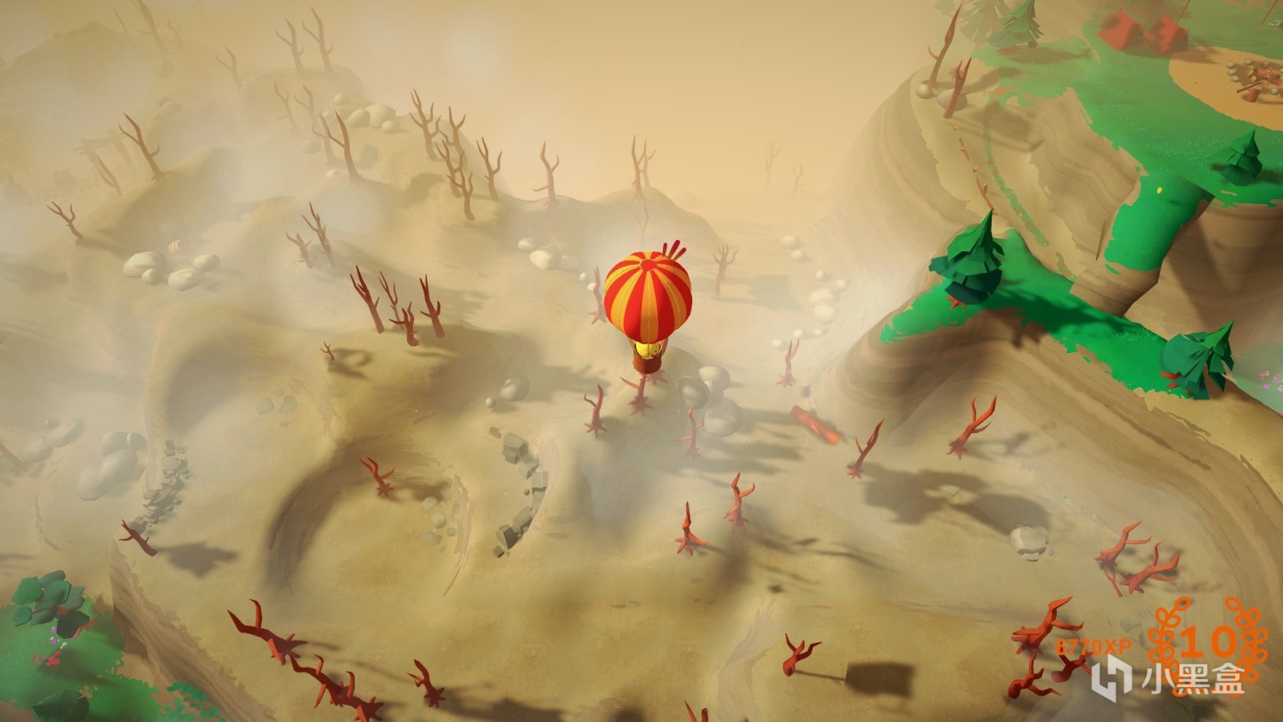 在所有营地解锁后,弗林特可以在任意营地的营火处召唤热气球,热气球可以飞向地图上的任何地方,无论距离高低,并且可以落在水中。可以说公园的深度探索从拥有热气球才是真正的开始。玩家随时可以从热气球上下来,垂直落在地面上,热气球则会缓慢降落到同一位置,这在收集悬崖峭壁的宝箱和修复公园犄角旮旯的设施上都十分便利。