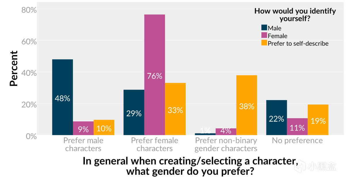 在此份调查报告的结果显示,参与测试的共有740名男性玩家,355人喜欢男性角色,215人喜欢女性角色,其余163人没有偏好,比例上有48%更喜欢玩男角色,有29%更喜欢玩女角色,有22%无所谓;参与测试共有230名女性玩家,175人喜欢女性角色,21人喜欢男性角色,其余25人没有偏好。数据上有76%更喜欢玩女角色,有9%更喜欢玩男角色,有11%无所谓。