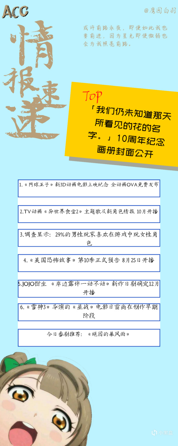 由A-1 Pictures制作的原创电视动画「我们仍未知道那天所看见的花的名字。」(未闻花名)在今年迎来了开播的十周年,官方公开了动画10周年纪念画册的封面图。该画册由一迅社出版,预计将于9月18日发售,现已开启预订。