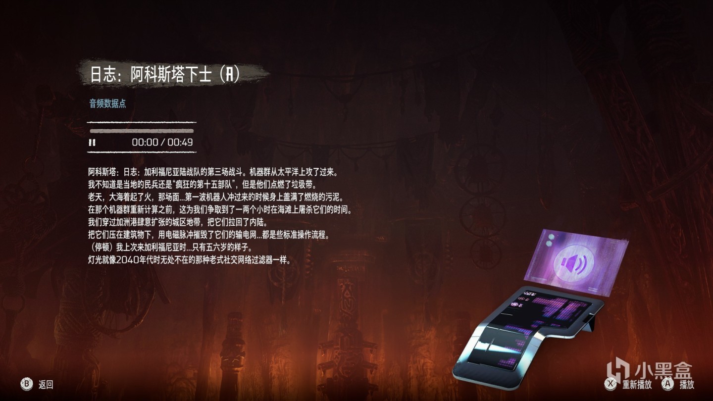 虽然主线剧情有着比支线更高的地位,但是很遗憾,主线也同支线一样是一杯白开水。剧情没有对参与主线的重要人物过多着笔,任务过后玩家很快就会忘记与自己并肩作战的小伙伴。即使我们记住了他们的名字,可是关掉游戏,问问自己,某角色究竟是个怎样的人?他们就如同微信上的点赞之交,一闪而过,什么都没有留下。即使是和埃洛伊最亲近的罗斯特也是通过女族长的口述来了解,更别提来一场互动电影式的过场CG或是玩家操控来一场冒险了。我们可以试想一下,如果《死亡搁浅》删除了其中的一战、二战剧情,对于角色性格的刻画是不是就没有那么饱满,剧情表现也失去了几分张力呢?对于“古代”世界的描写,我们也只能通过散落在各地的文件、录音和优势系统里的全息影响来一探究竟。