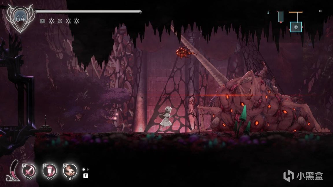 而到禁区就下滑到了一个巅峰,由于探索各种难点(超级跳什么的)已经在之前用的差不多了,禁区竟然使用了堆怪这种最笨重的手段来增加探索地图的难度,无脑堆高怪物的伤害,堆高硬直,甚至就把收集物放在难打怪物的脚下。这在我眼里是失败的,银河城类游戏玩的是探索地图的乐趣,而不是跟魂类游戏打败难打怪物的那种成就感,隐藏房间的发现、隐藏物品的找寻,这些才是快乐的来源,所以在设计上有些本末倒置,是拉低评分的地图设计。