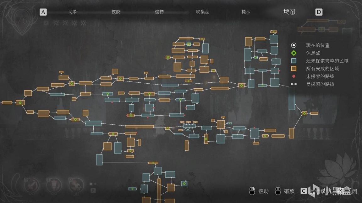 不同于盐之避难所的大规模学习魂的设计,终焉莉莉还是加入了地图设计,作为银河城类游戏,盐与避难所因为没有加入地图导致后续清理地图的时候非常困难,基本依靠于背地图,对于广大银河城玩家来说基本算是败笔,本作倒是在学习盐与避难所中改良了设计,甚至还加入了探索完地图的全部物品,地图会变色这一设定,更好的辅助了玩家的探索地图进程。